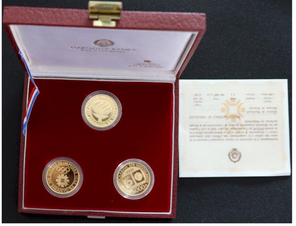 1984 Sarajevo Winter Olympics 3-coin Gold Proof Set. This set was produced by the National Bank of Yugoslavia, all 3 coins have a legal tender face value of 5000 Dinars and are .900 Fine and weigh 8 grams each (.6945 oz total) . Set comes in original Mint case with C.O.A.