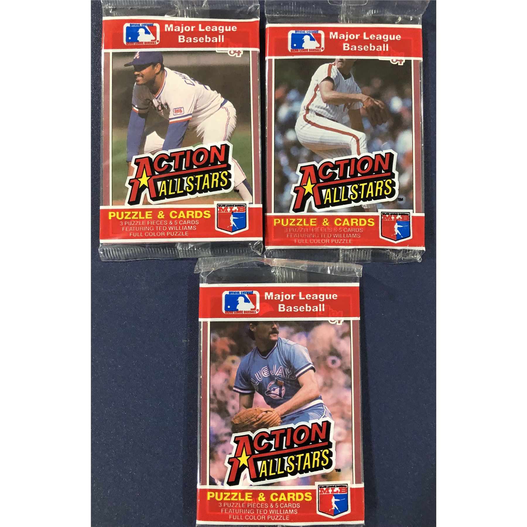Three sealed cello packs, each containing 5 postcard size cards plus 3 puzzle pieces MLB, baseball, vintage