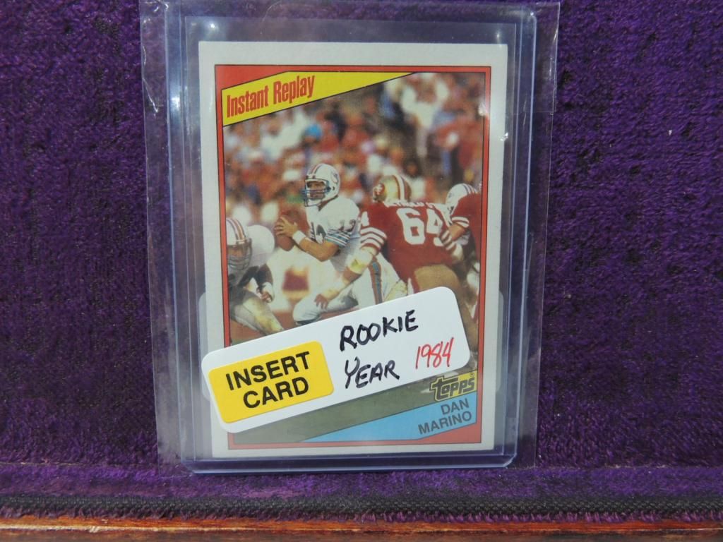 INSERT CARD. 1984 ROOKIE OF THE YEAR. DAN MARINO. FOOTBALL PLAYER CARD. IN GOOD CONDITION. IN PLASTIC PROTECTIVE SLEEVE. TRADING CARD. COLLECTIBLE. AS SHOWN. SEE PHOTO FOR MORE DETAILS.