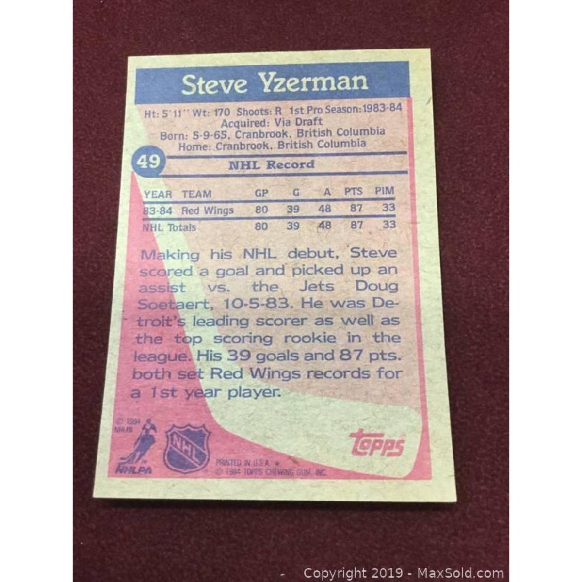 1984 Vintage Steve Yzerman Rookie Card
