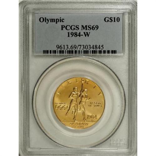 <B>1984-W G$10 Olympic Gold Ten Dollar MS69 PCGS.</B></I> PCGS Population (1246/27). NGC Census: (836/372). Mintage: 75,800. Numismedia Wsl. Price for NGC/PCGS coin in MS69: $445. (#9613)<BR><BR><b>Shipping:</b> Coins & Currency (<a target="_blank" href="http://www.heritageauctions.com/common/shipping.php">view shipping information</a>)