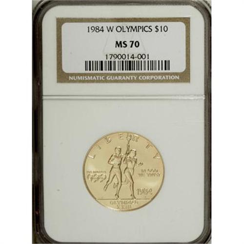 <B>1984-W G$10 Olympic Gold Ten Dollar MS70 NGC.</B></I> NGC Census: (317/0). PCGS Population (22/0). Mintage: 75,800. Numismedia Wsl. Price for NGC/PCGS coin in MS70: $525. (#9613)<BR><BR><b>Shipping:</b> Coins & Currency (<a target="_blank" href="http://www.heritageauctions.com/common/shipping.php">view shipping information</a>)
