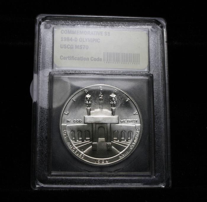We have the entire P, D, S, three piece set up tonight! One of three coins minted to mark the 1984 Olympic games. PCGS lists the 1984-d in ms70 as elusive and ms69 at $33. This example is graded ms70 by USCG. Estimated Value $40.