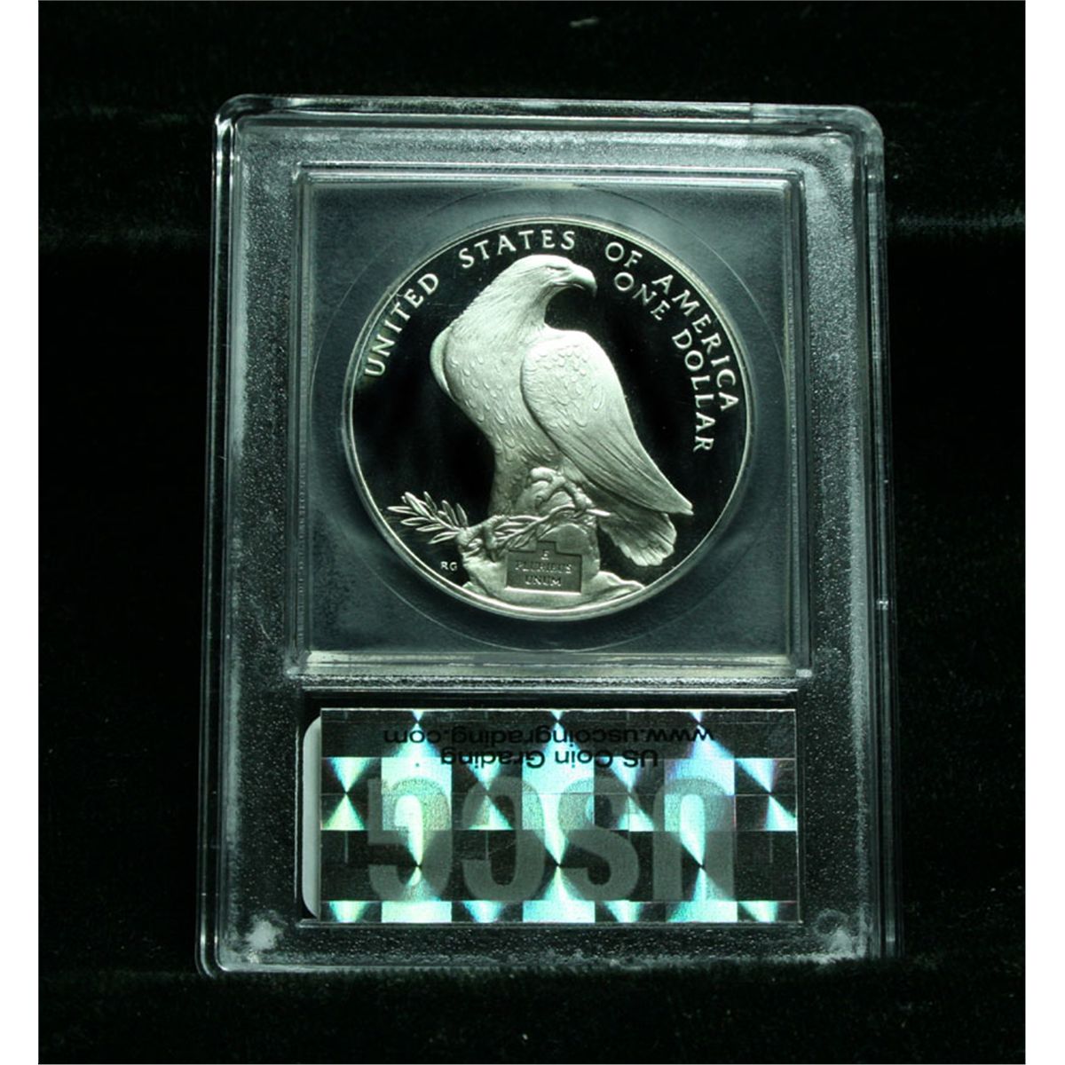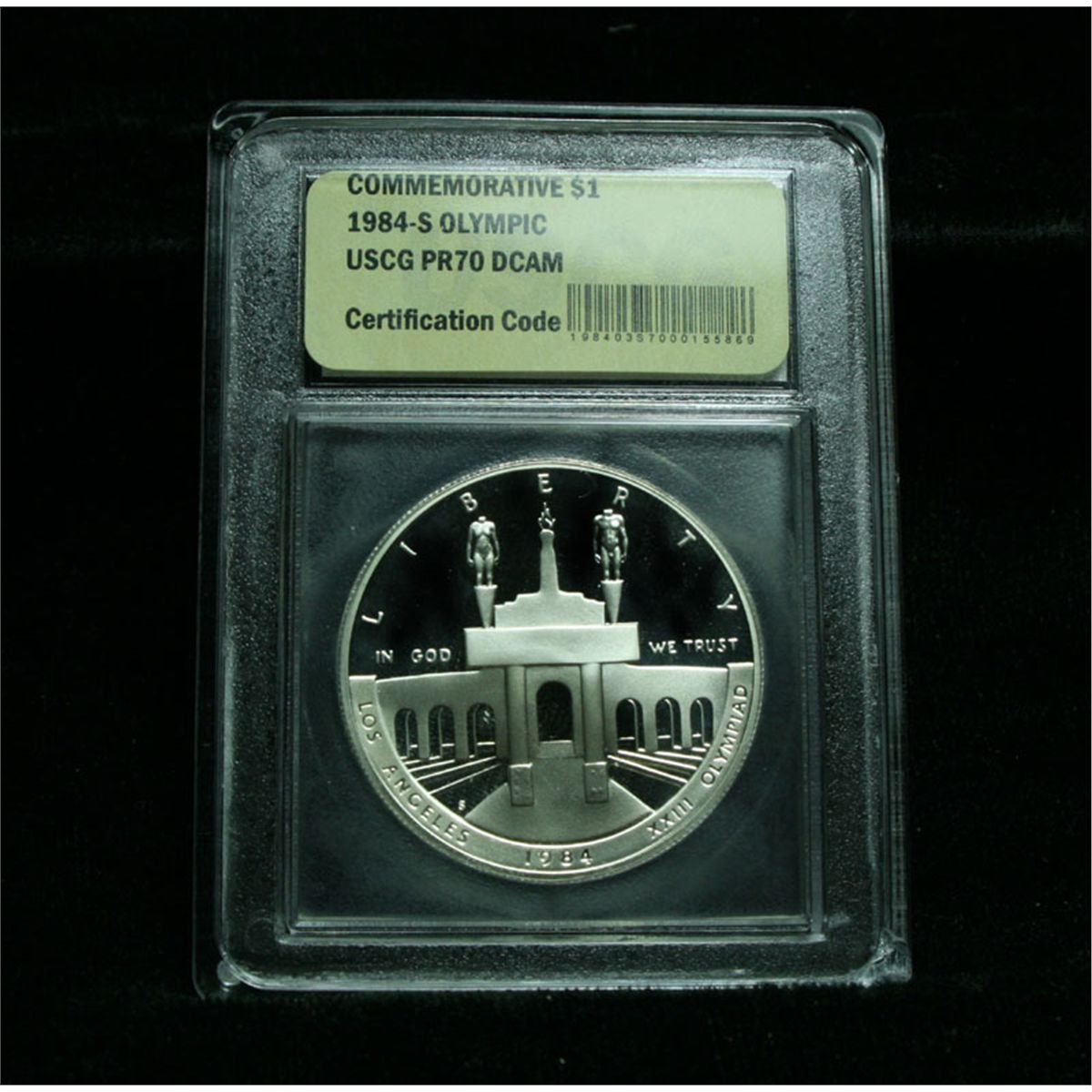 One of three coins minted in 1983 to mark the 1984 Olympic games. PCGS lists the 1983-s in PR70 DCAM at $1250. This example is graded PR70 DCAM by USCG. Estimated Value $300.