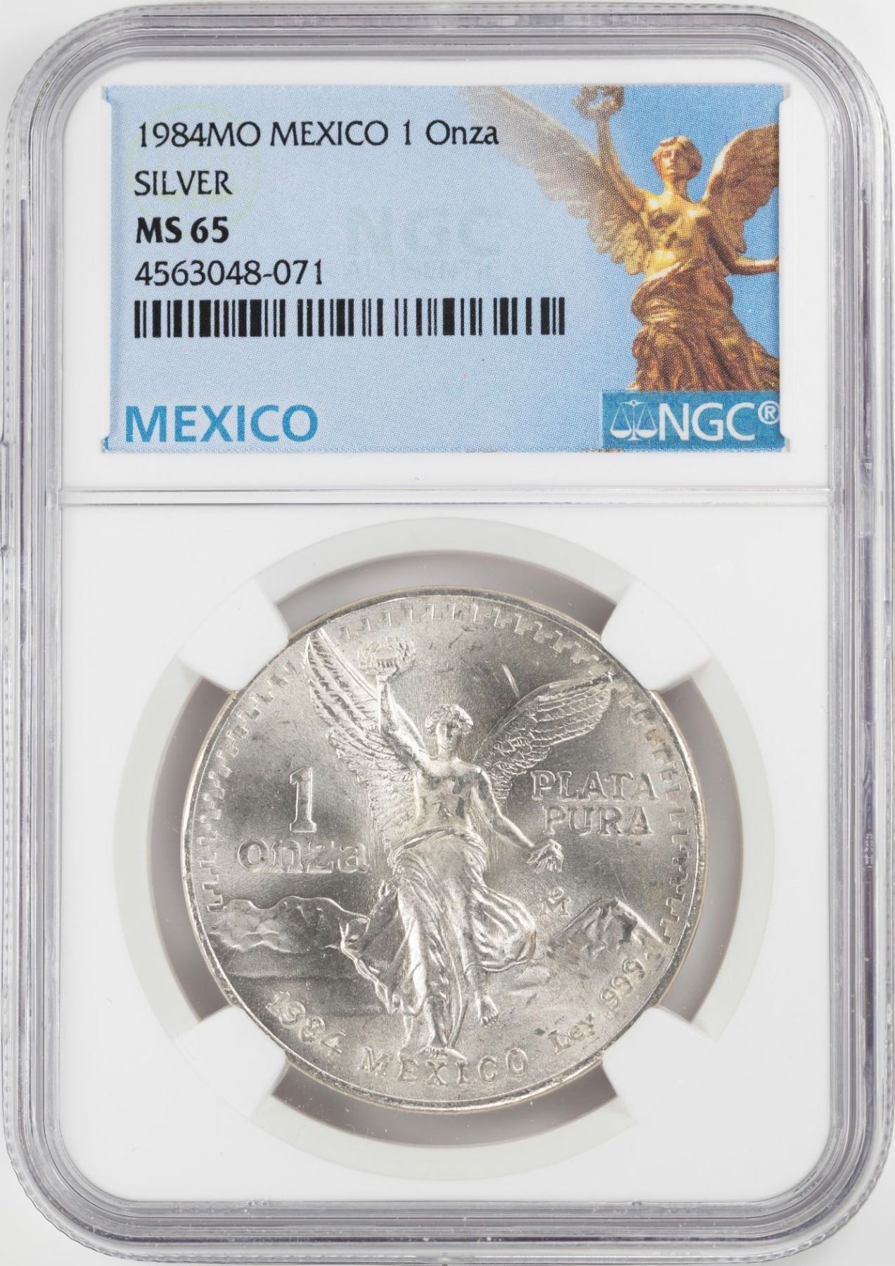 One 1984Mo Mexico 1 Onza Libertad Silver Coin NGC MS65.