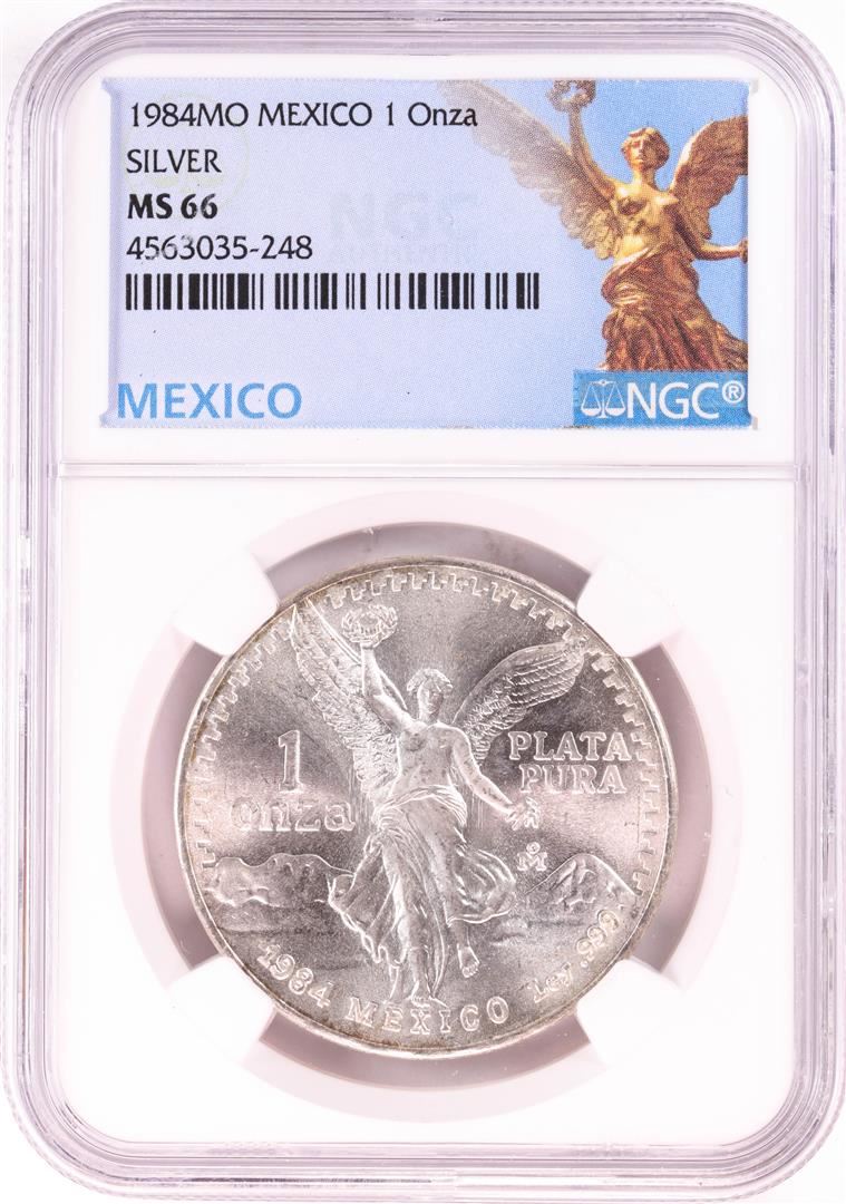One 1984Mo Mexico 1 Onza Libertad Silver Coin NGC MS66. NGC Certified.