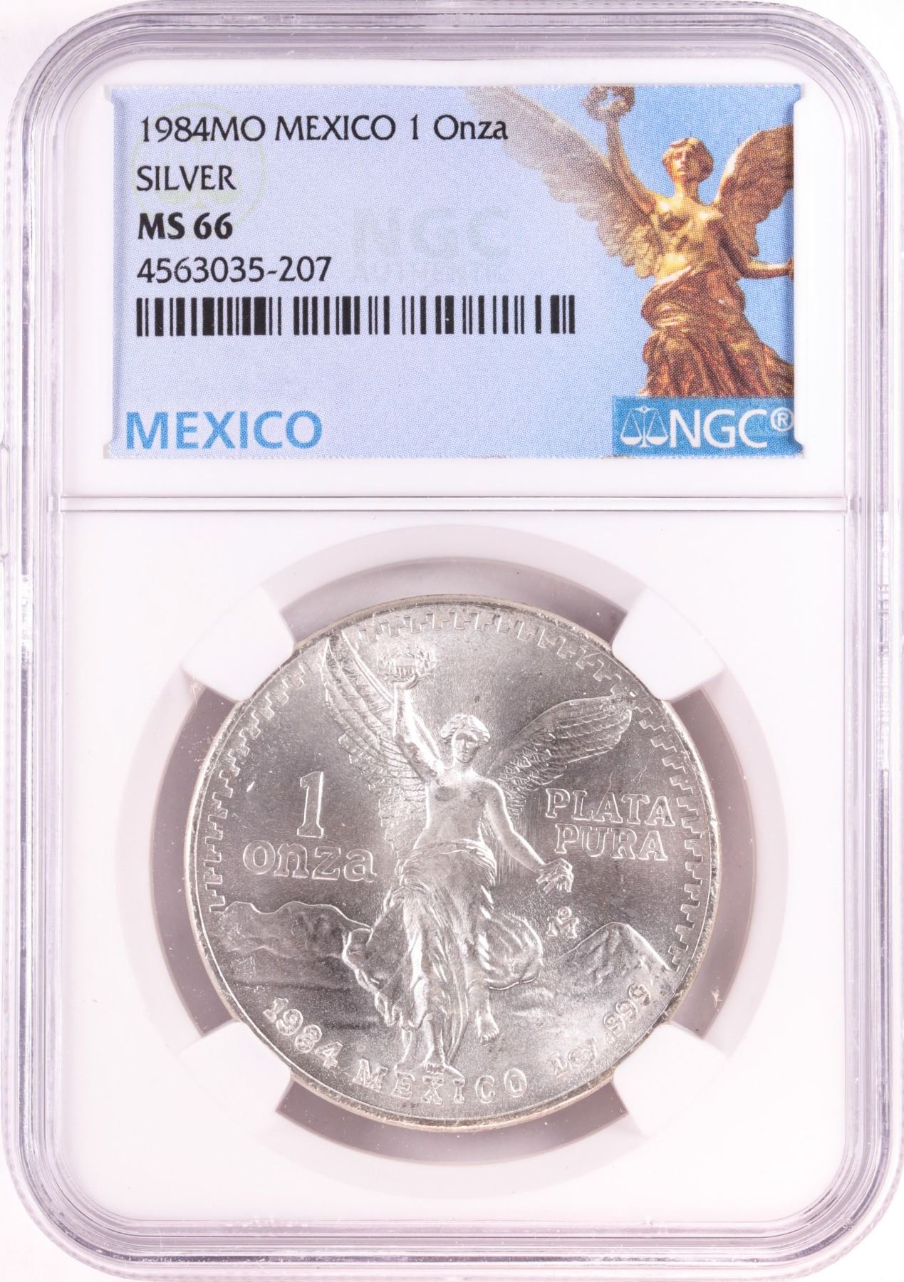 One 1984Mo Mexico 1 Onza Libertad Silver Coin NGC MS66.
