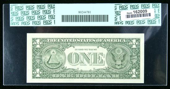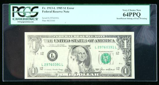1985, $1 Federal Reserve Note. ERROR. Insufficient Inking of 2nd Printing. . Fr-1913-L. PCGS graded Very Choice New 64 PPQ Insufficient inking of face printing.