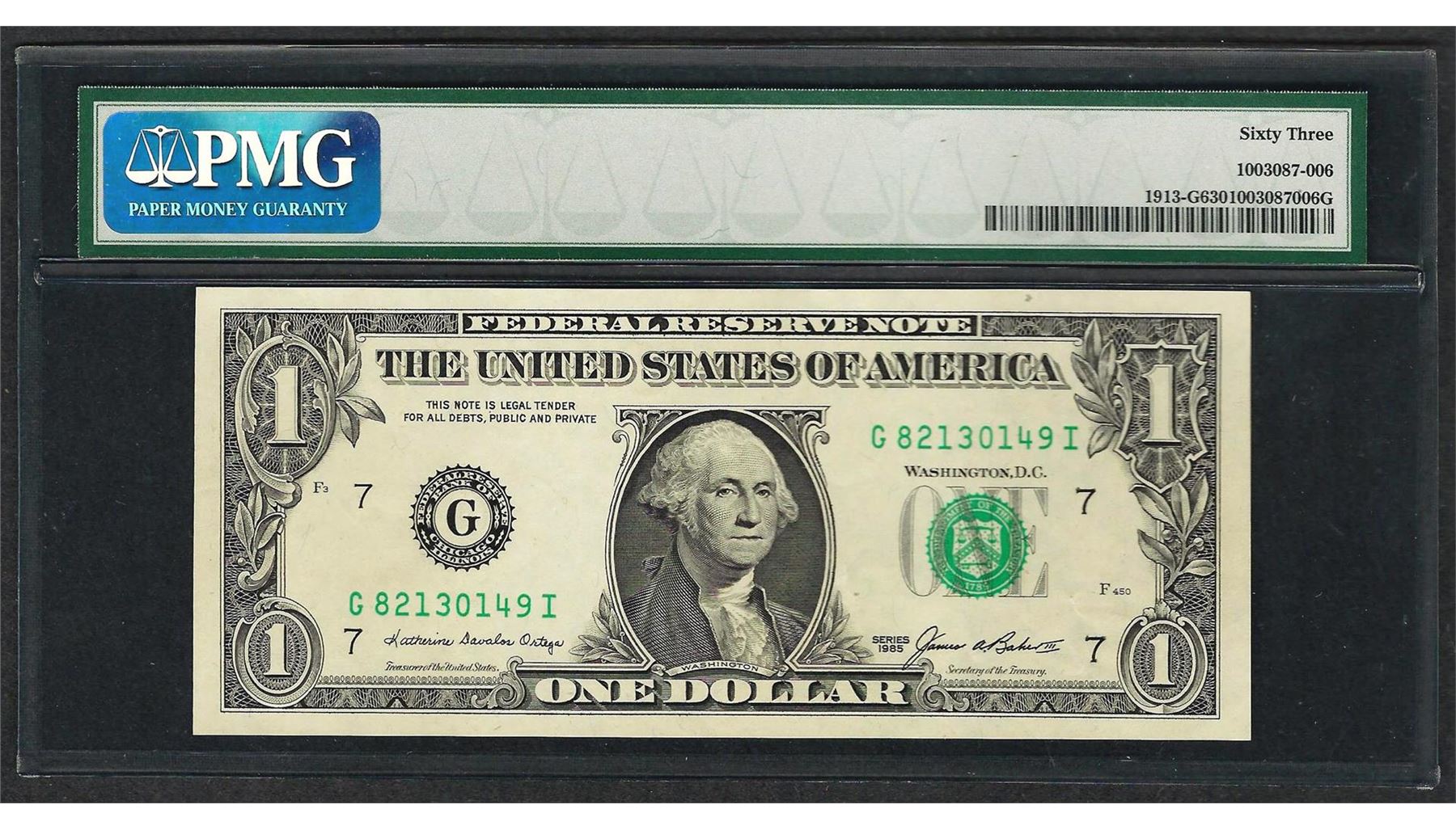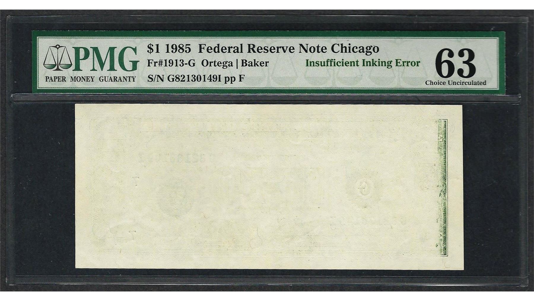 One 1985 $1 Federal Reserve Note ERROR Insufficient Inking PMG Choice Uncirculated 63. PMG Certified.