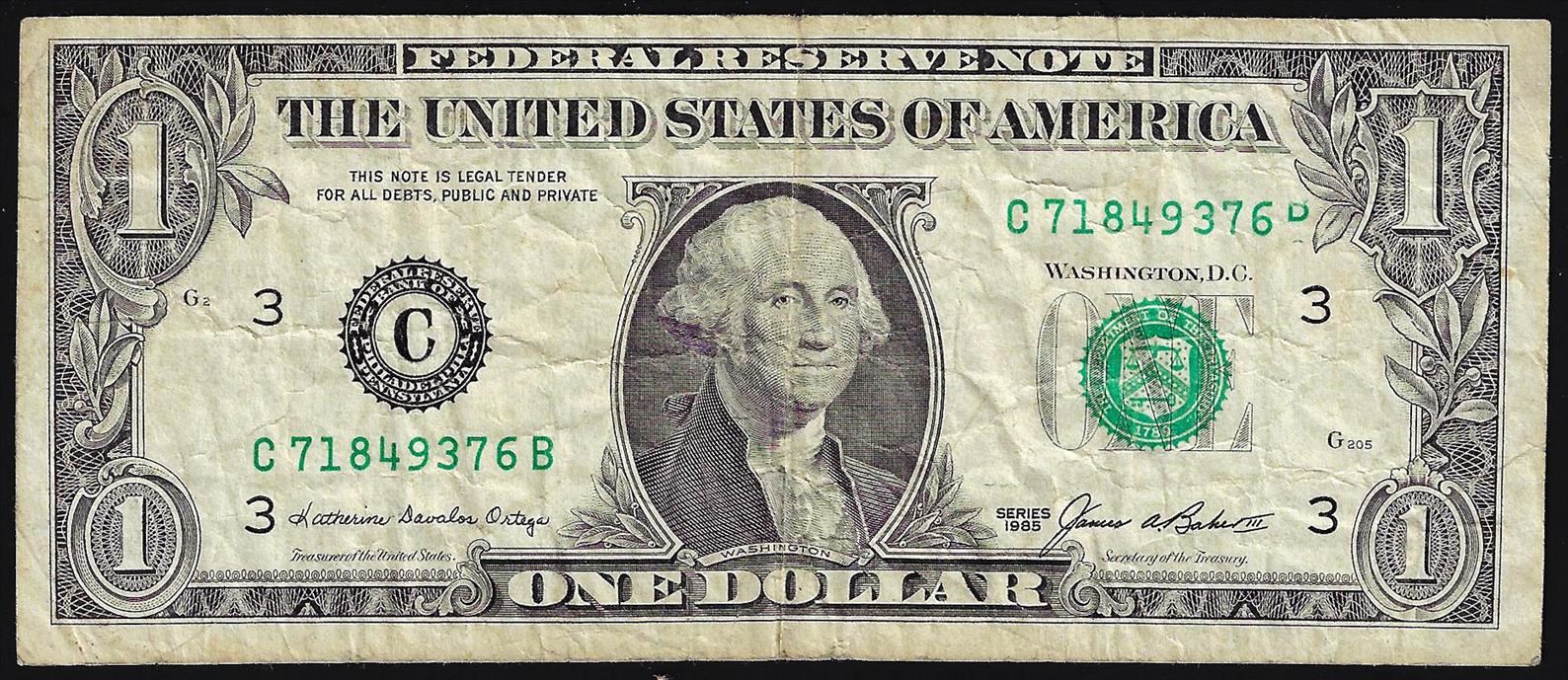 One 1985 $1 Federal Reserve Note Stuck Digit ERROR.