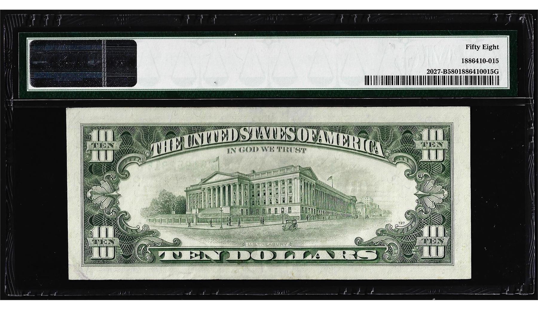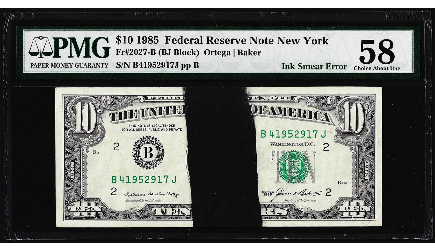One 1985 $10 Federal Reserve Note Ink Smear ERROR PMG Choice About Uncirculated 58. PMG Certified.