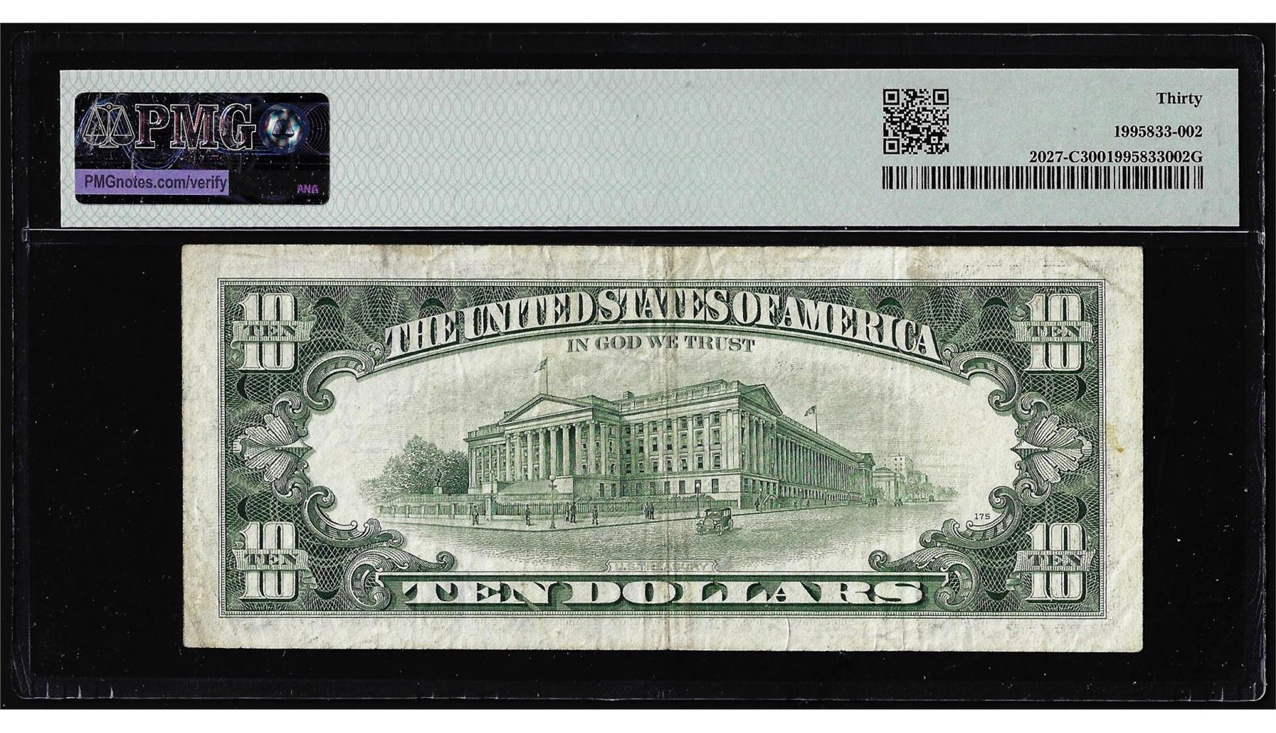 One 1985 $10 Federal Reserve Note Loose Cylinder Error Fr.2027-C PMG Very Fine 30. PMG Certified.