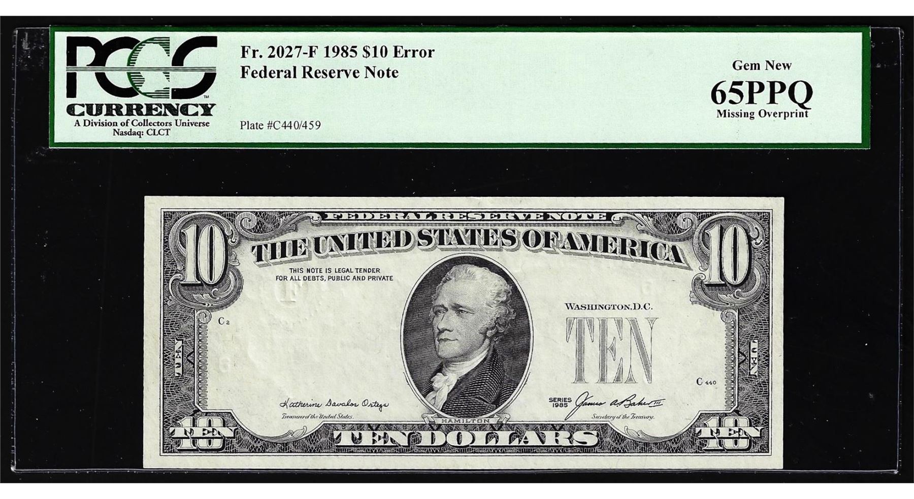 1985 $10 Federal Reserve Note Missing Overprint Error Fr.2027-F PCGS Gem New 65PPQ
