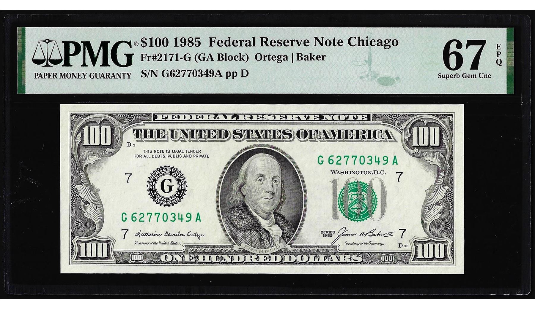 One 1985 $100 Federal Reserve Note Chicago Fr.2171-G PMG Gem Unc 67EPQ. PMG Certified.