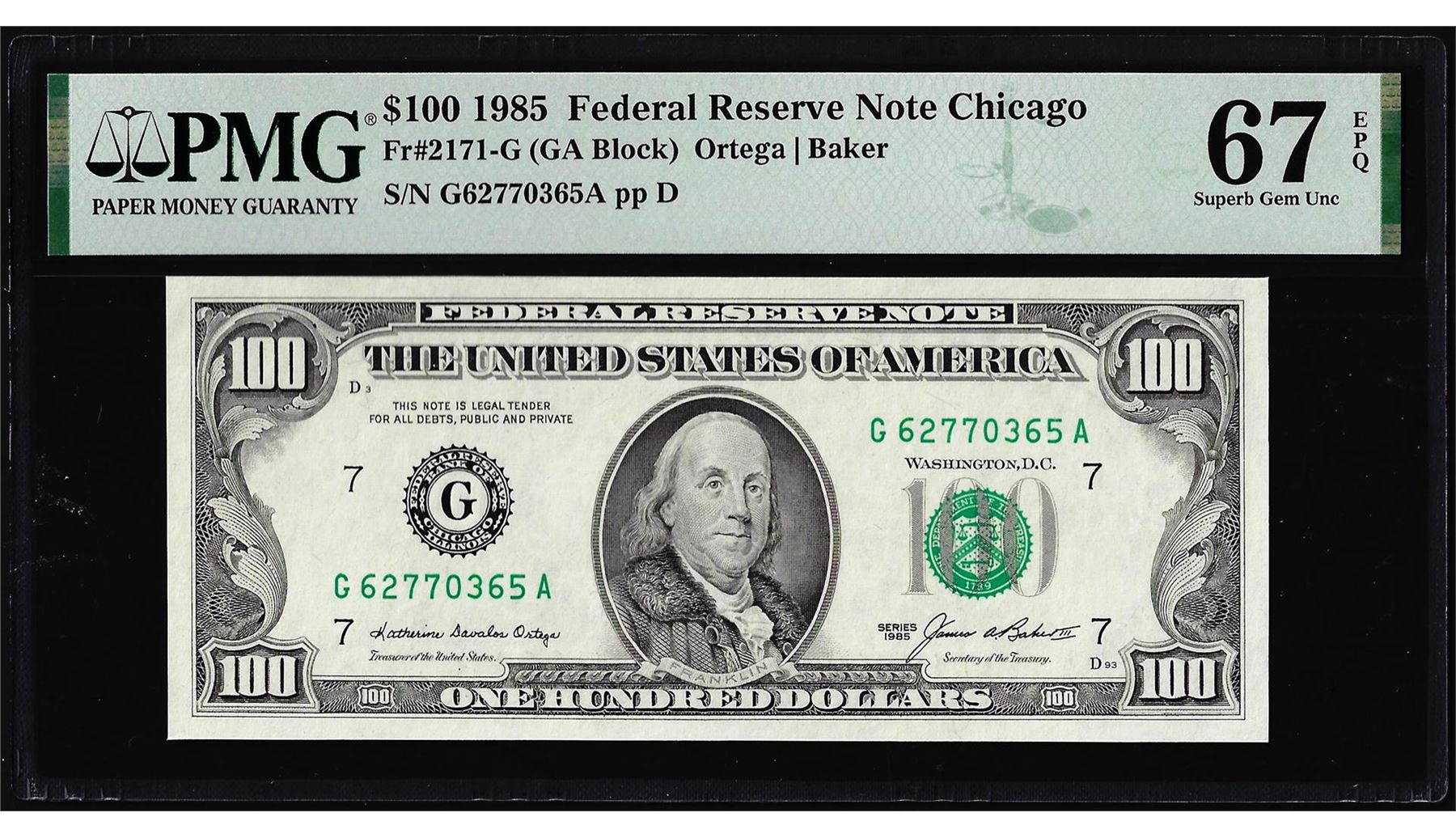 1985 $100 Federal Reserve Note Chicago Fr.2171-G PMG Gem Unc 67EPQ