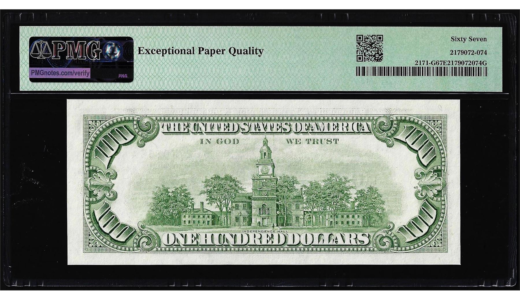 One 1985 $100 Federal Reserve Note Chicago Fr.2171-G PMG Gem Unc 67EPQ. PMG Certified.