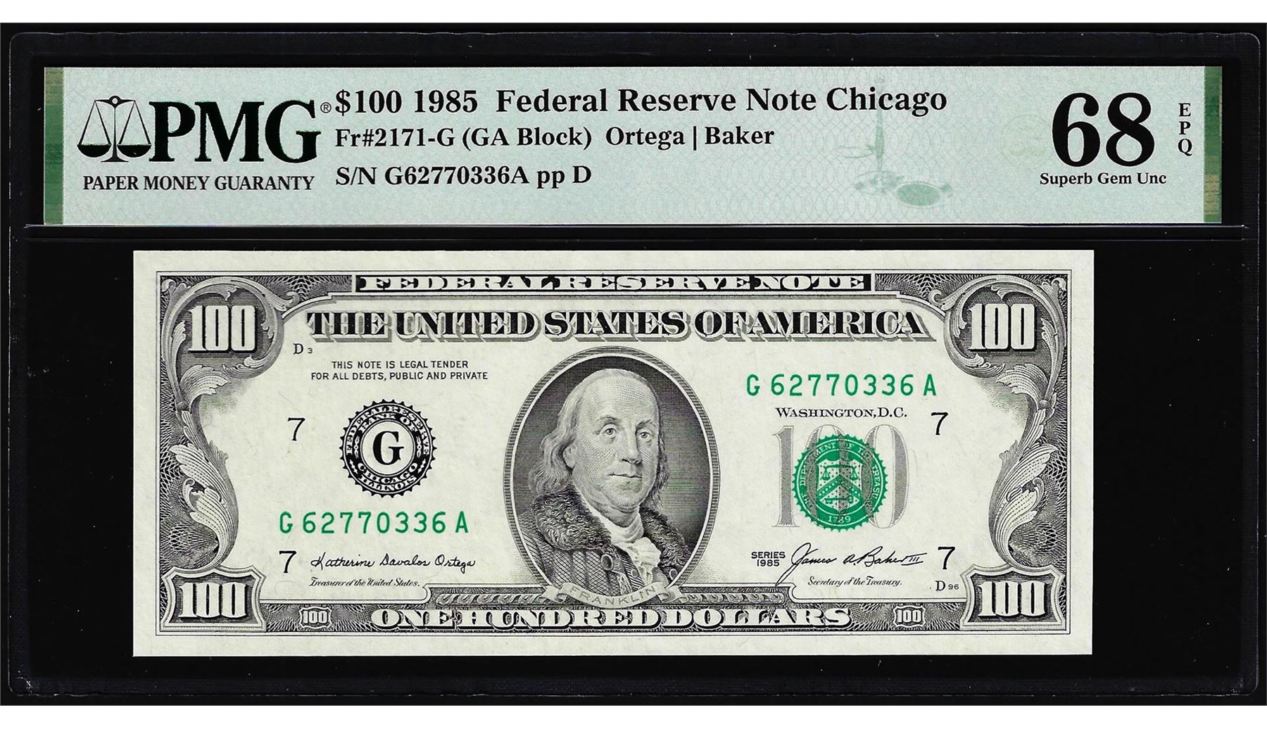 One 1985 $100 Federal Reserve Note Chicago Fr.2171-G PMG Superb Gem Uncirculated 68EPQ. PMG Certified.