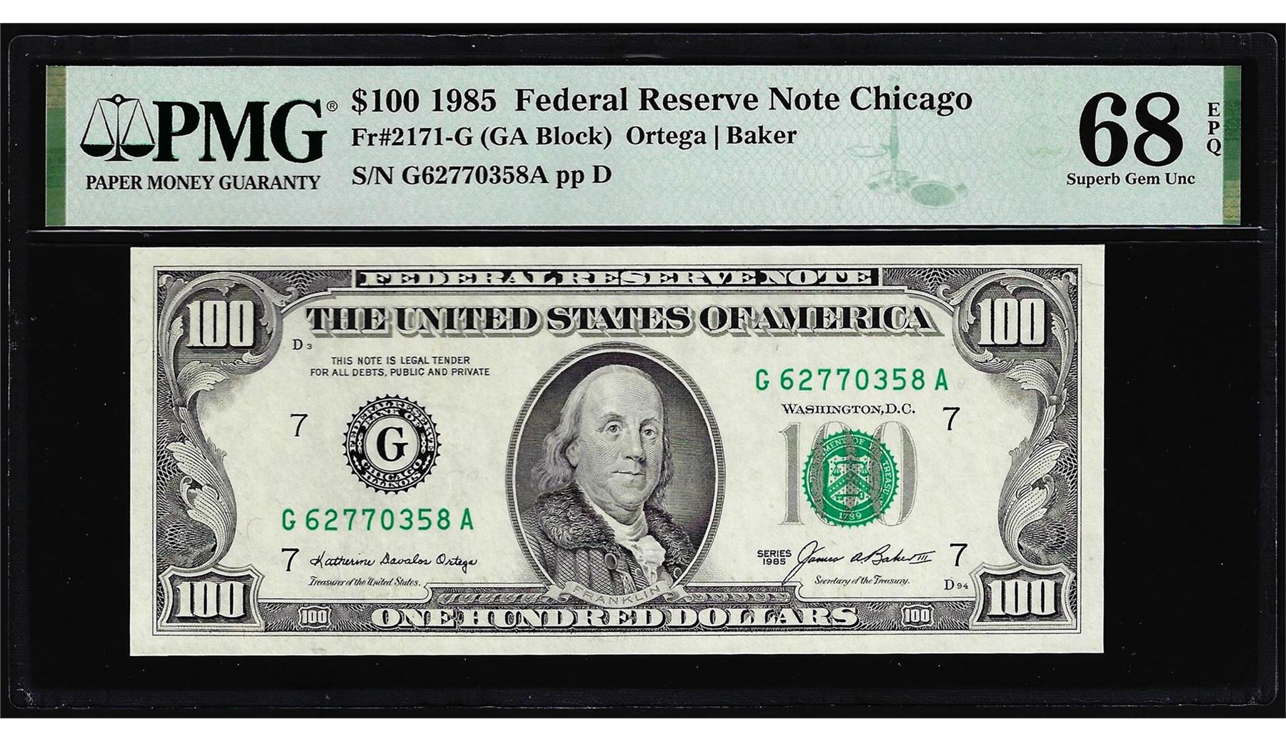 One 1985 $100 Federal Reserve Note Chicago Fr.2171-G PMG Superb Gem Uncirculated 68EPQ. PMG Certified.