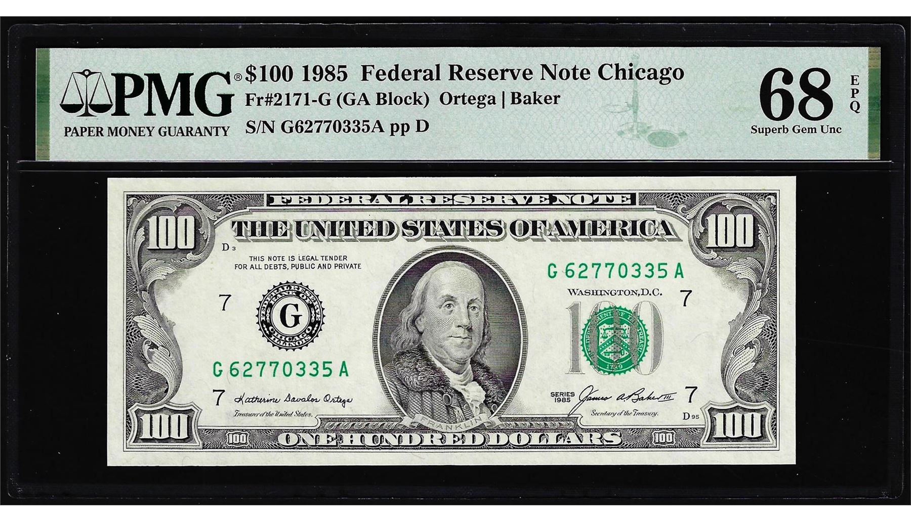 One 1985 $100 Federal Reserve Note Chicago Fr.2171-G PMG Superb Gem Uncirculated 68EPQ. PMG Certified.