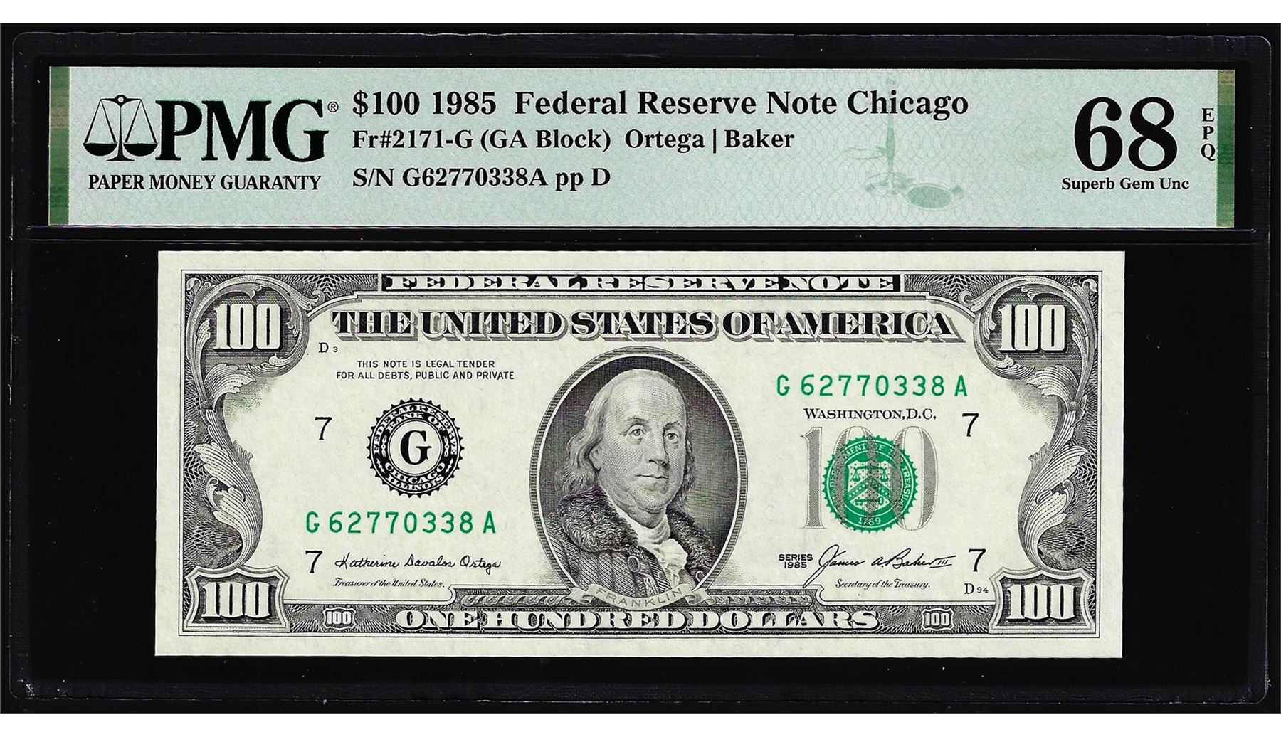 One 1985 $100 Federal Reserve Note Chicago Fr.2171-G PMG Superb Gem Uncirculated 68EPQ. PMG Certified.