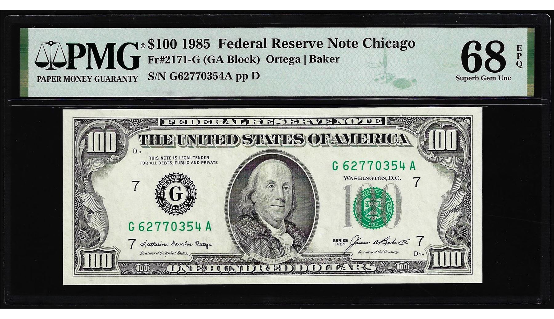 1985 $100 Federal Reserve Note Chicago Fr.2171-G PMG Superb Gem Uncirculated 68EPQ