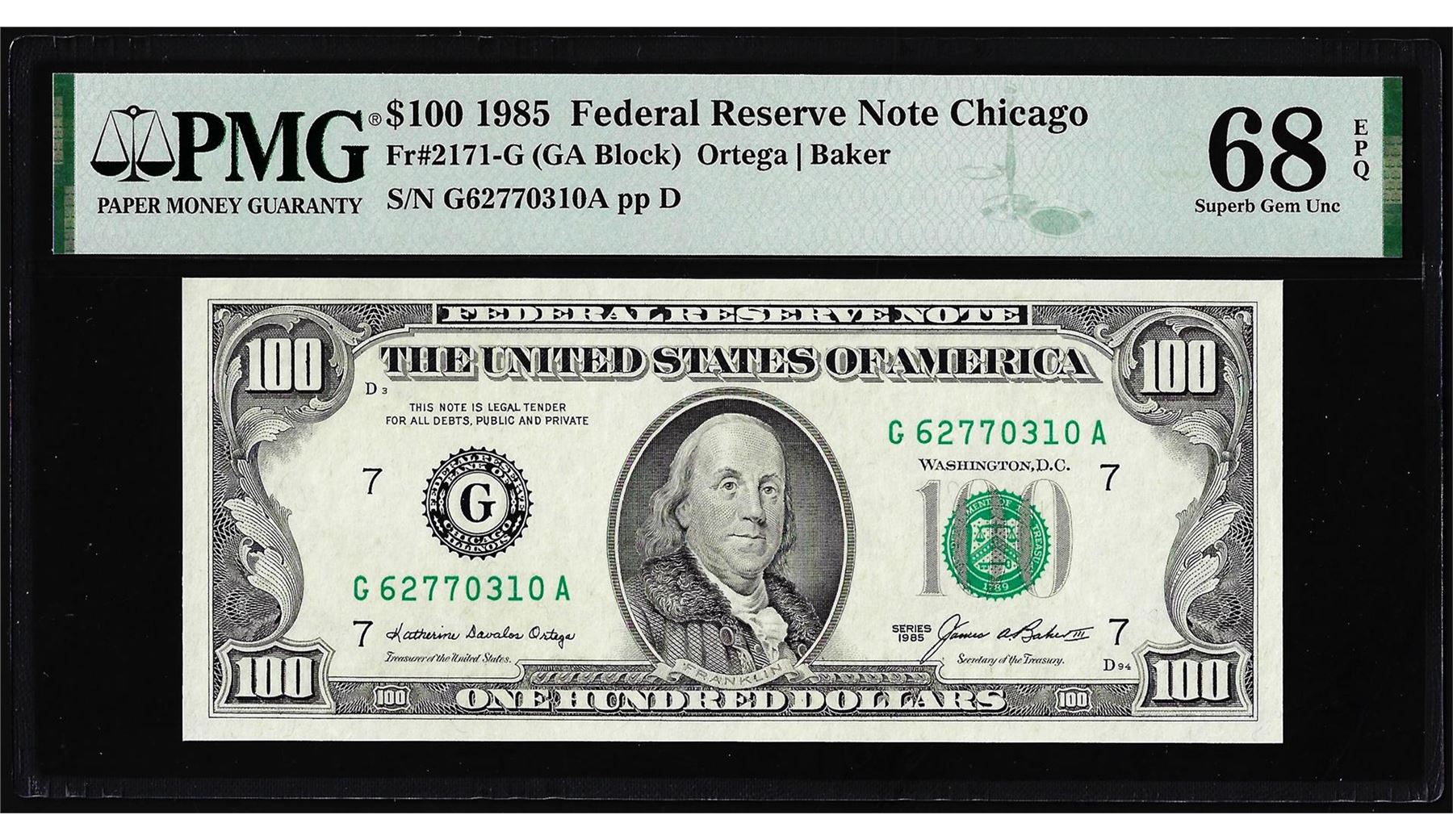 One 1985 $100 Federal Reserve Note Chicago Fr.2171-G PMG Superb Gem Uncirculated 68EPQ. PMG Certified.