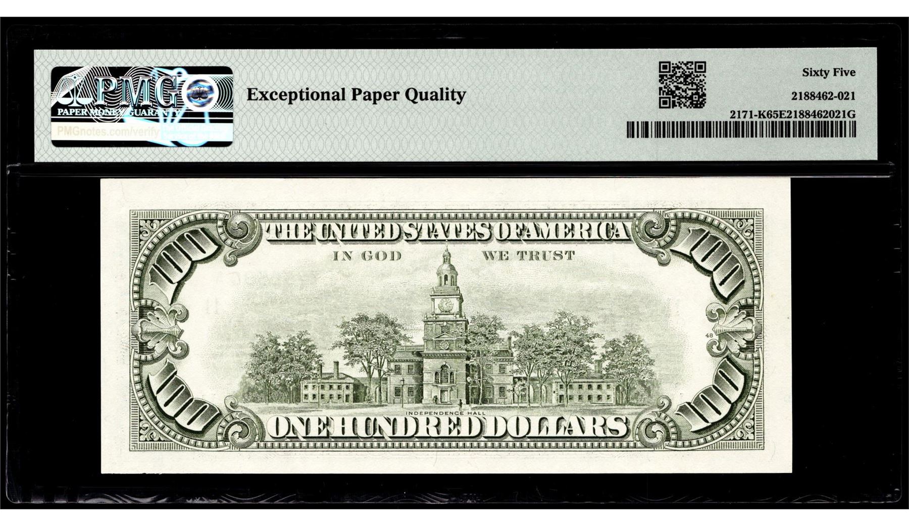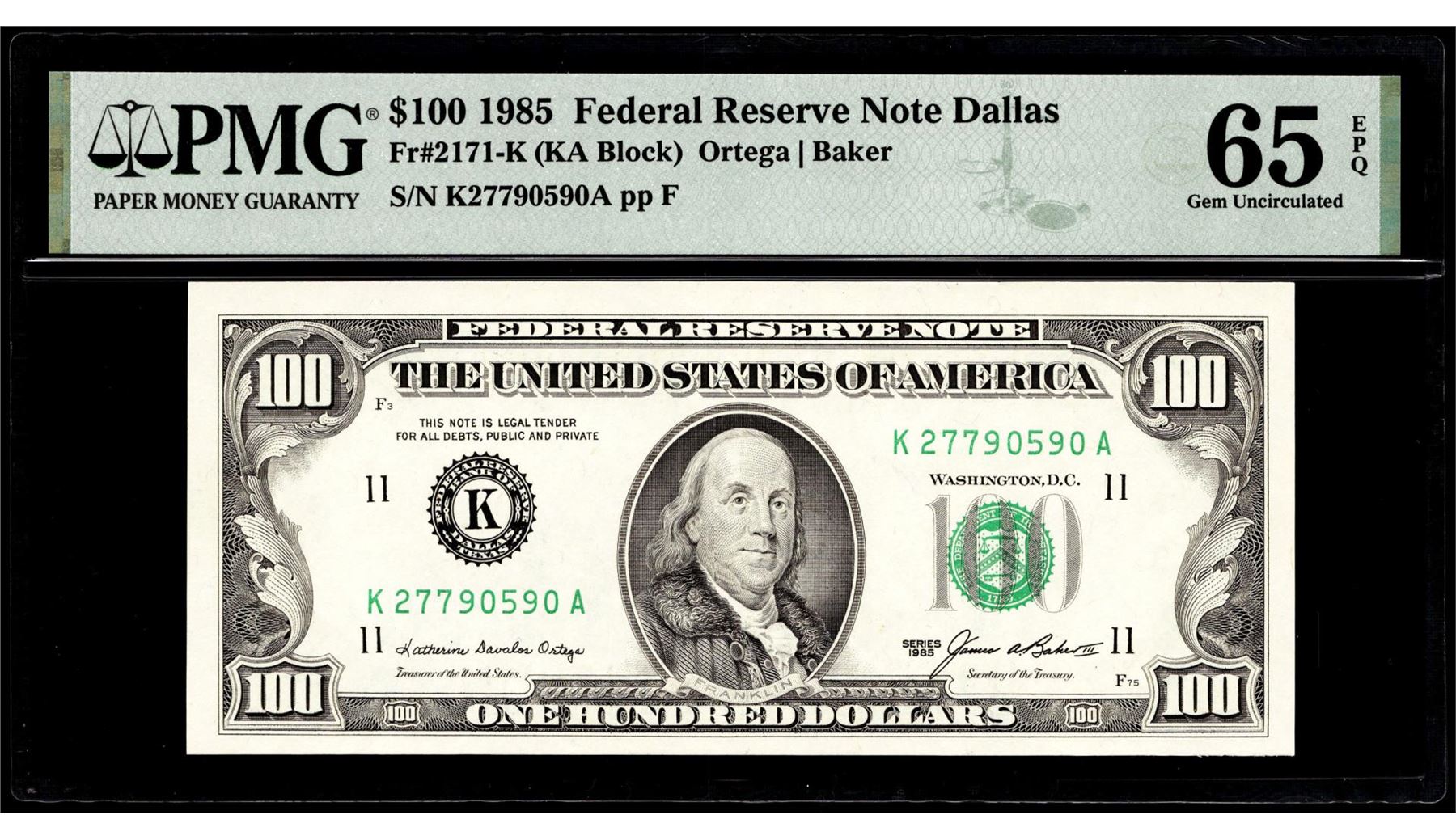 One 1985 $100 Federal Reserve Note Dallas Fr.2171-K PMG Gem Uncirculated 65EPQ. PMG Certified.
