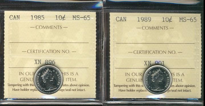 1985 & 1989 10¢ ICCS MS65. Lot of 2 coins.