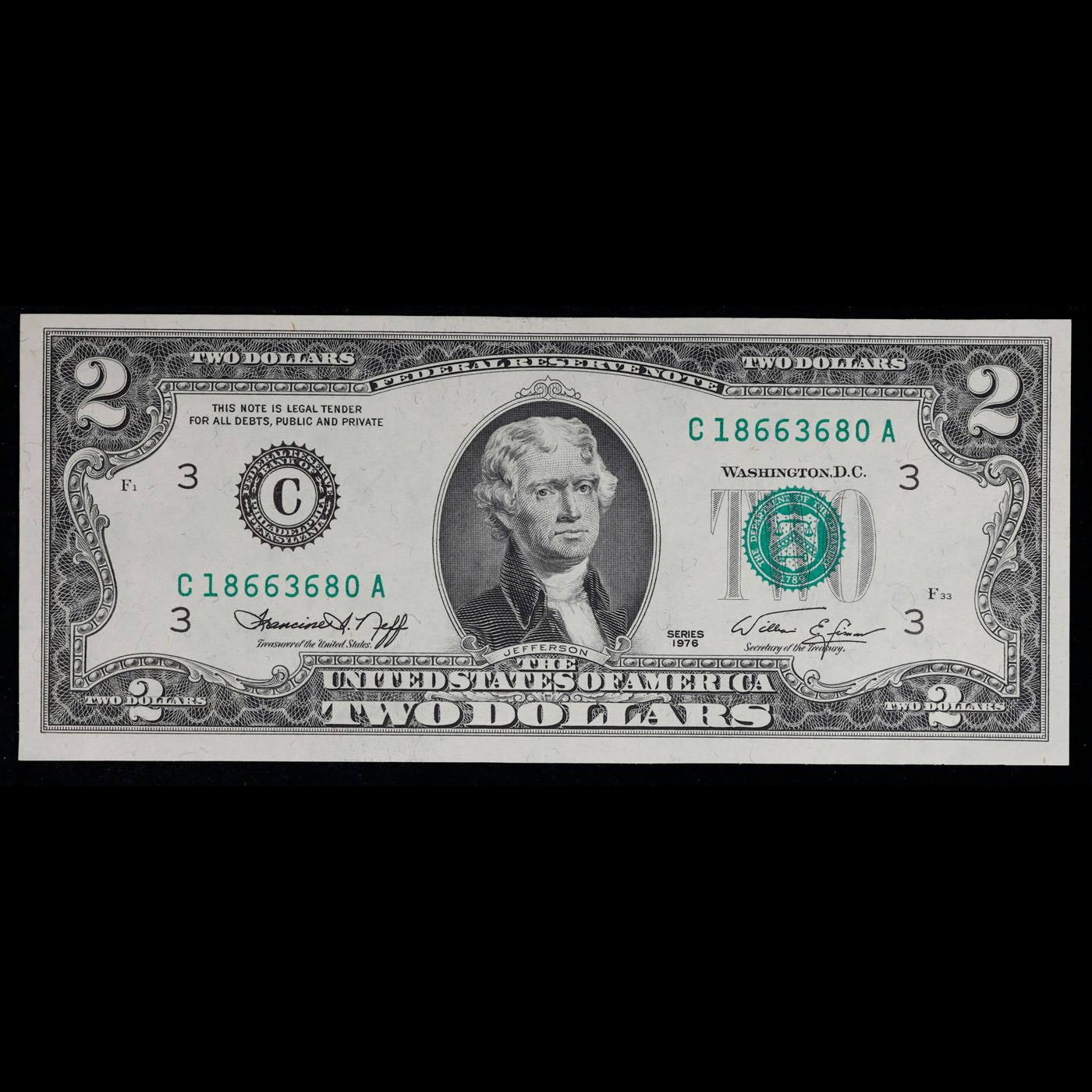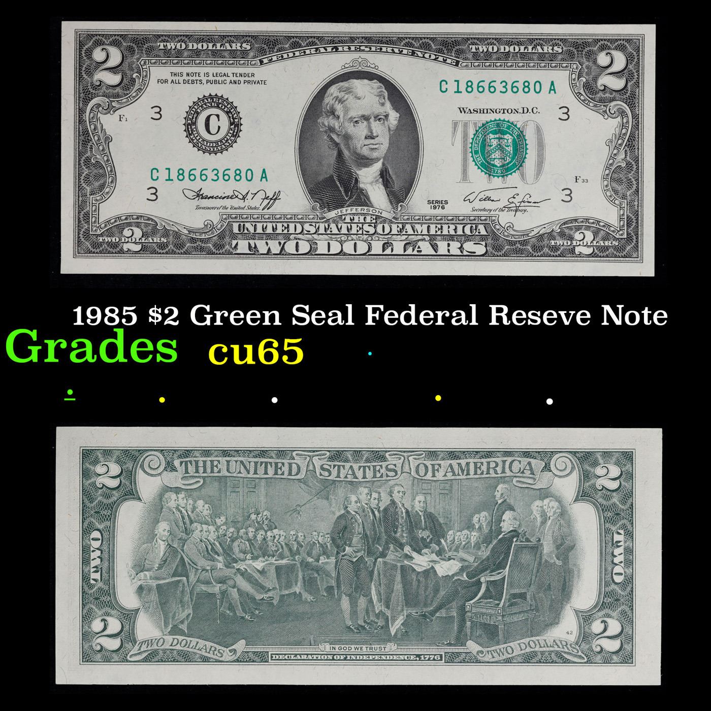 1985 $2 Green Seal Federal Reseve Note Grades Gem CU.