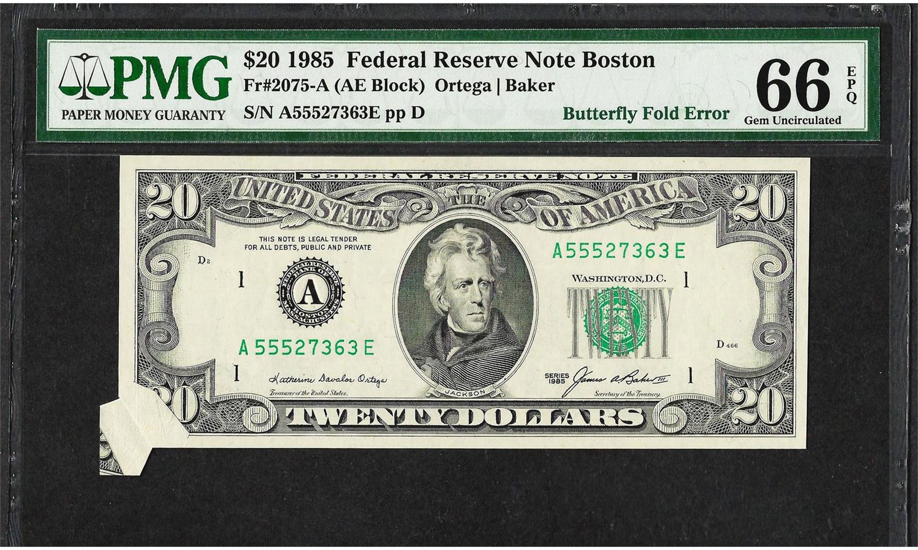 One 1985 $20 Federal Reserve Note Butterfly Fold ERROR PMG Gem Uncirculated 66EPQ. PMG Certified.