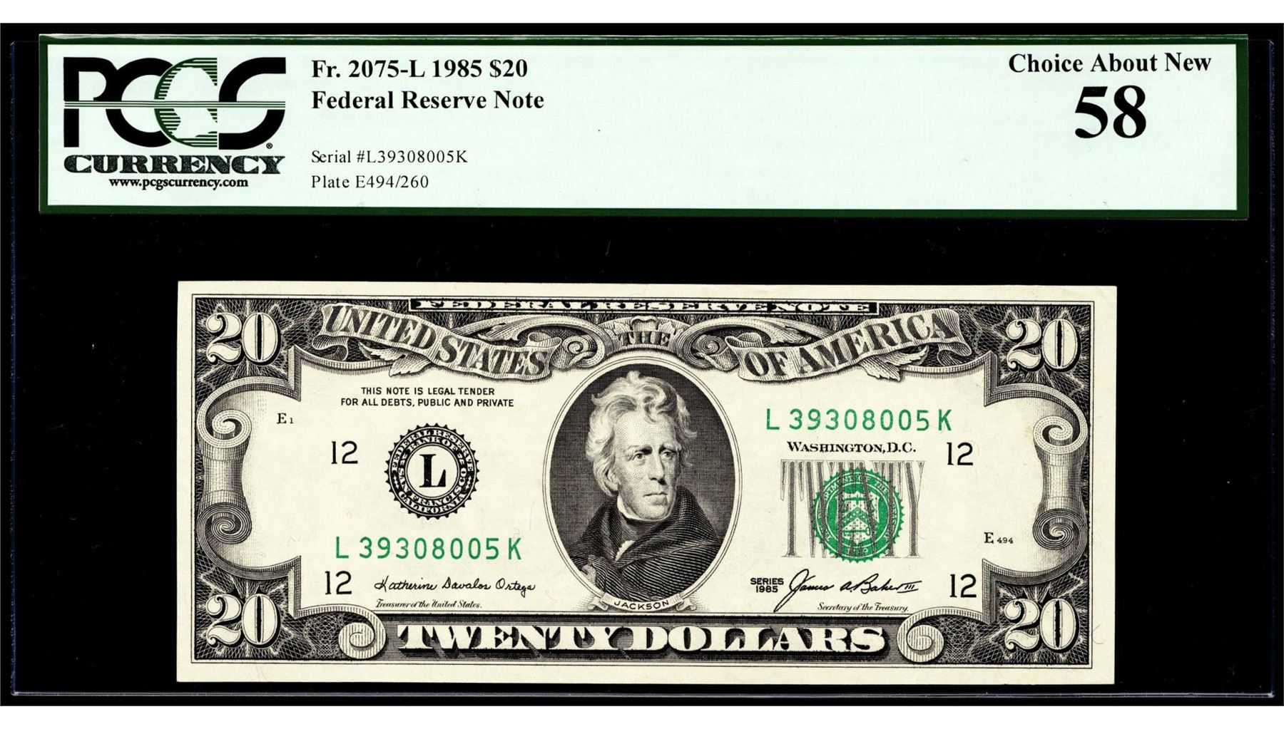 One 1985 $20 Federal Reserve Note San Francisco Fr.2075-L PCGS Choice About New 58. PCGS Graded.