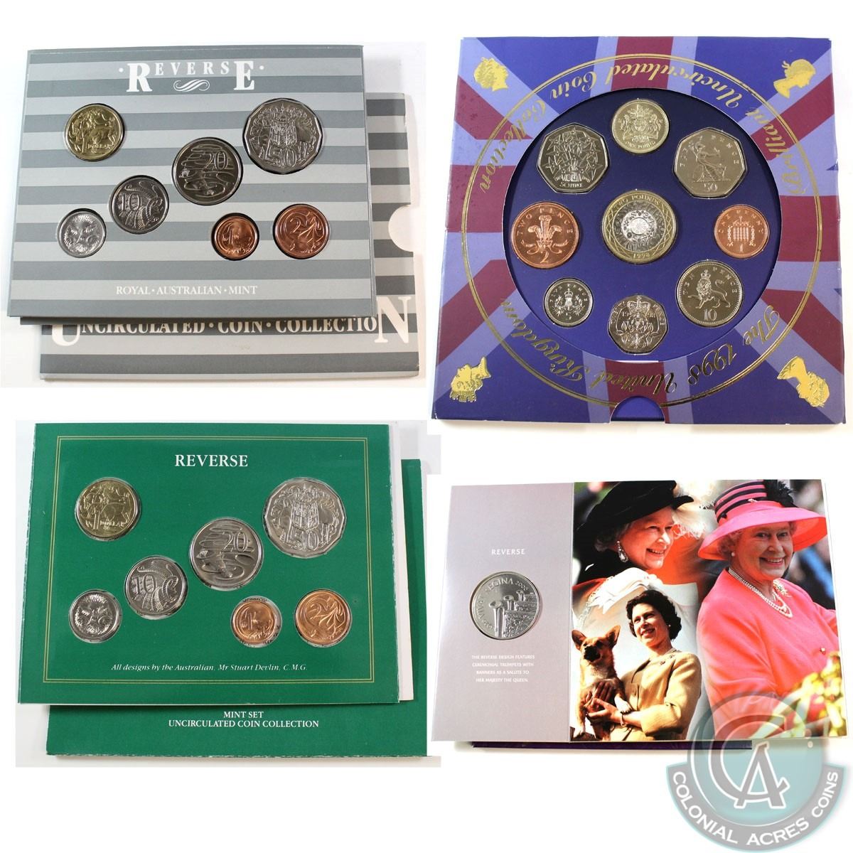 1985-2006 World Coin Collection. You will receive: 1985 Australia Mint Uncirculated Coin Set, 1987 Australia Mint Uncirculated Coin Set, 1998 United Kingdom Uncirculated Coin Set, and 2006 United Kingdom Crown Her Majesty Queen Elizabeth II 80th Birthday (Packaging has come unglued) 4pcs.