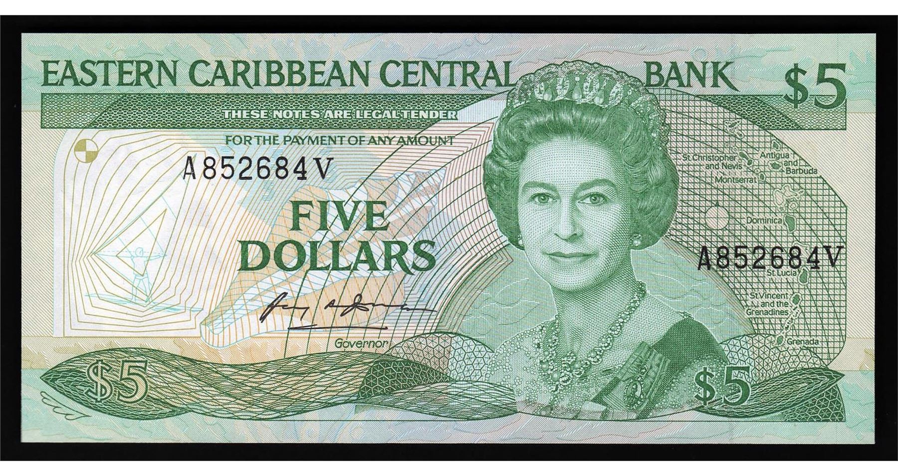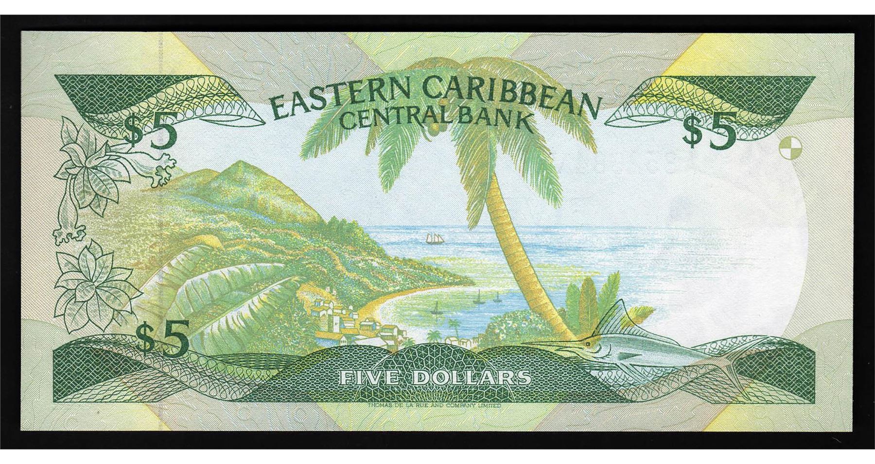 One 1985 $5 Eastern Caribbean Central Bank Note.