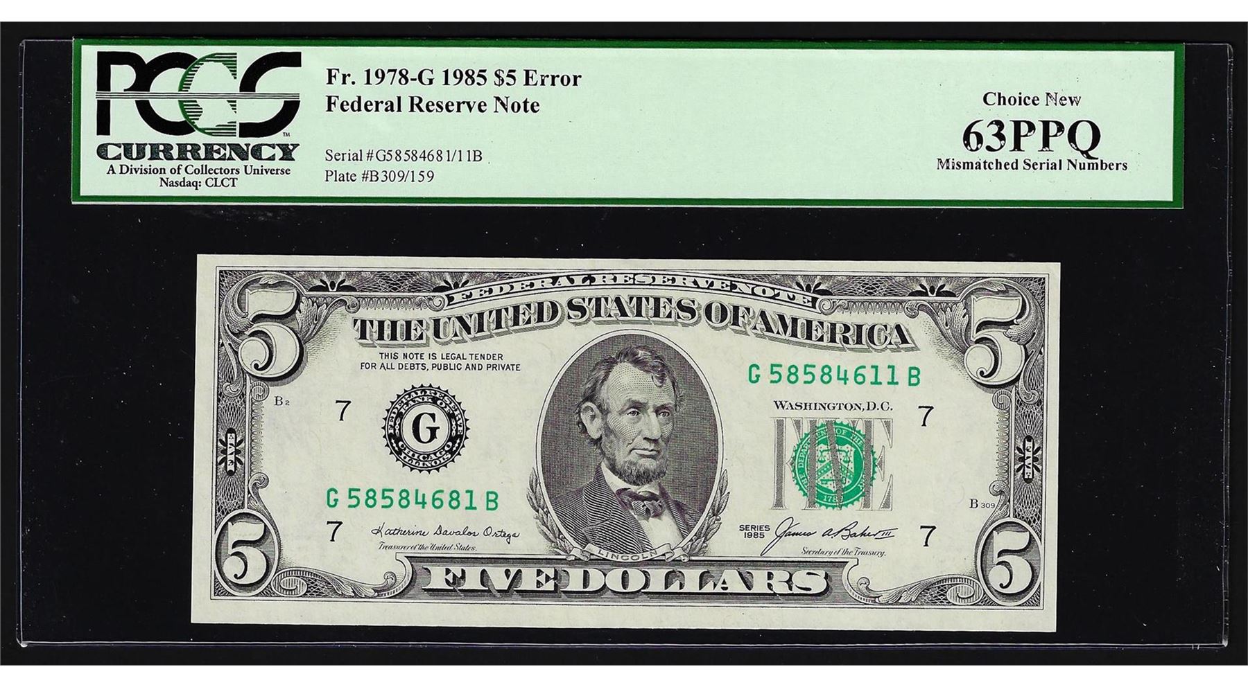 One 1985 $5 Federal Reserve Note 2 Digit Mismatched Serial Number ERROR PCGS Choice 63PPQ. PCGS Certified.