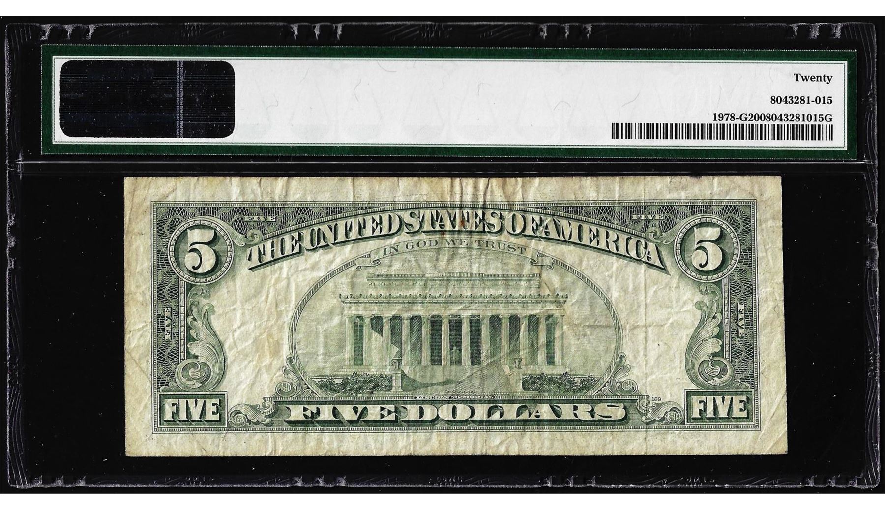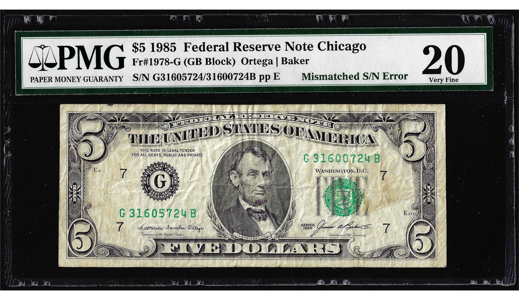 One 1985 $5 Federal Reserve Note Mismatched Serial Number Error Fr.1978-G PMG Very Fine 20. PMG Certified.