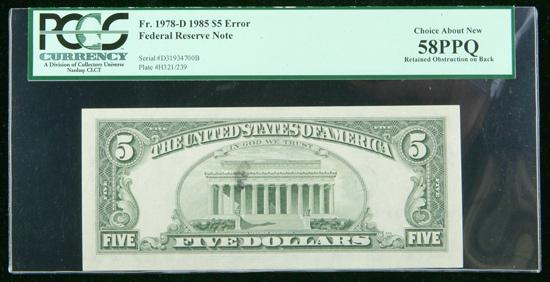 1985, $5 Federal Reserve Note. Retained Obstruction on Back. PCGS Choice About New 58PPQ. . Fr-1978-D. A small piece of transparent plastic has been retained on the back of this note beneath the back (first) printing. Retained obstructions of any kind are scarce, as most are flagged and destroyed before they leave the BEP, or those that do escape usually lose the foreign object or paper scrap that caused the obstructed printing.