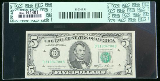 1985, $5 Federal Reserve Note. Retained Obstruction