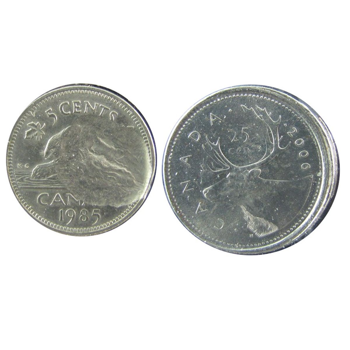 1985 5¢ with gouged planchet and 2006P 25¢ with broken collar. Lot of 2 B.U. error coins.