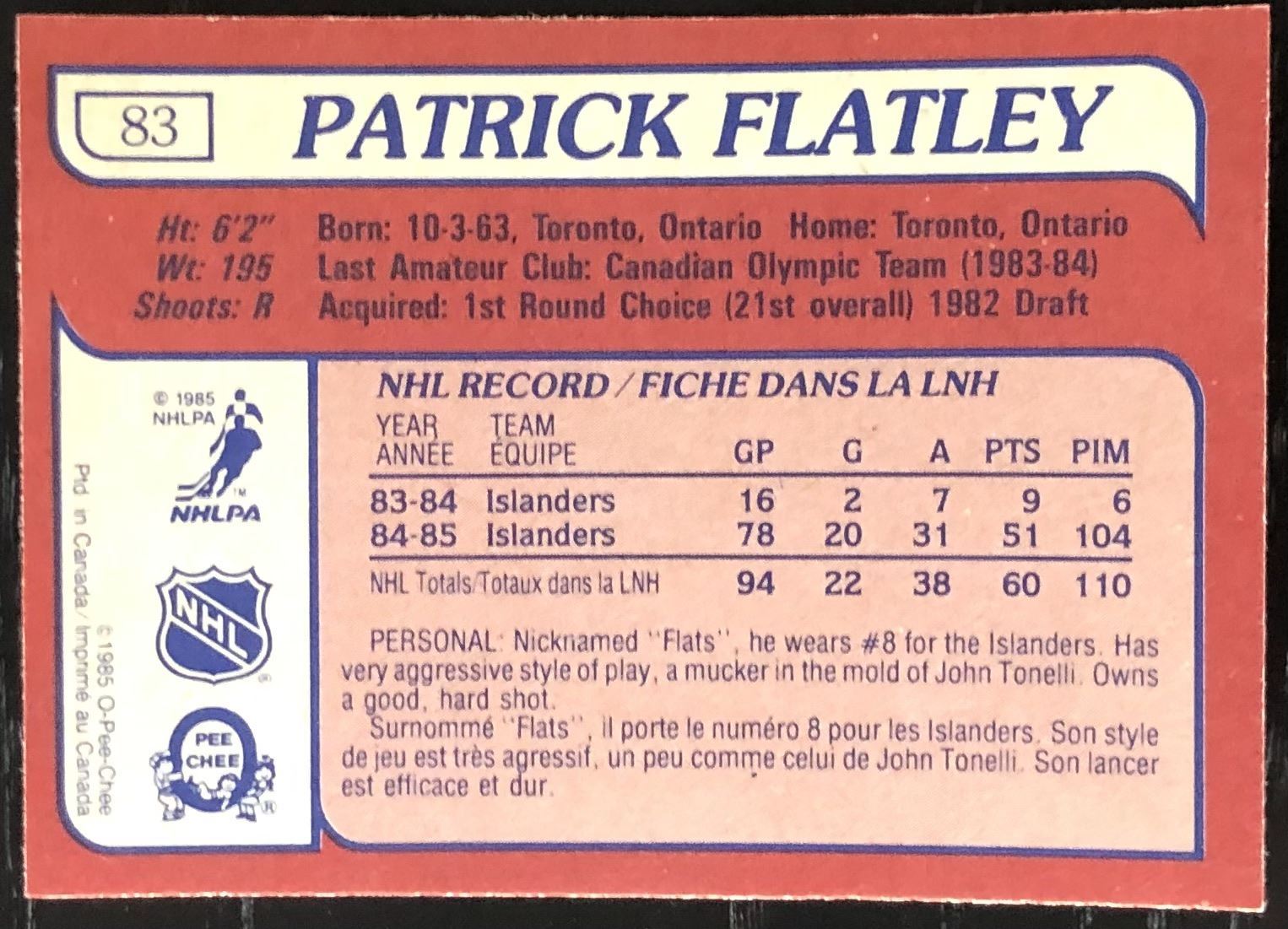 Card #83 NHL, hockey, OPC, vintage, rookie