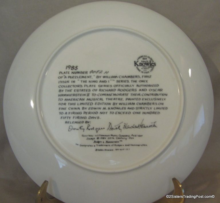 8 1/2" plate, dated 1985 'A Puzzlement' by William Chambers and is the first in the series 'The King and I' offered by Knowles. Plate number is 9082H comes in original box with paperwork and COA. (Please see images for details).