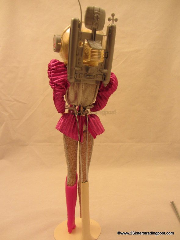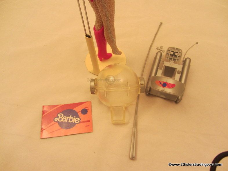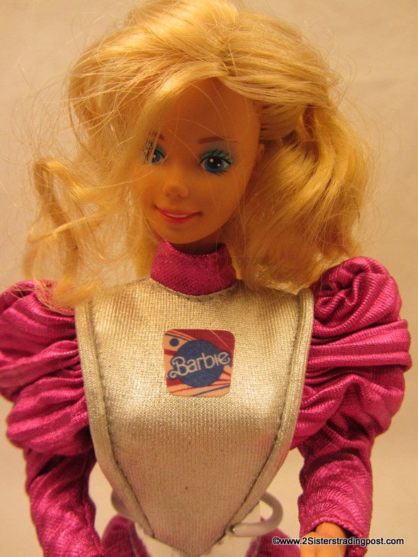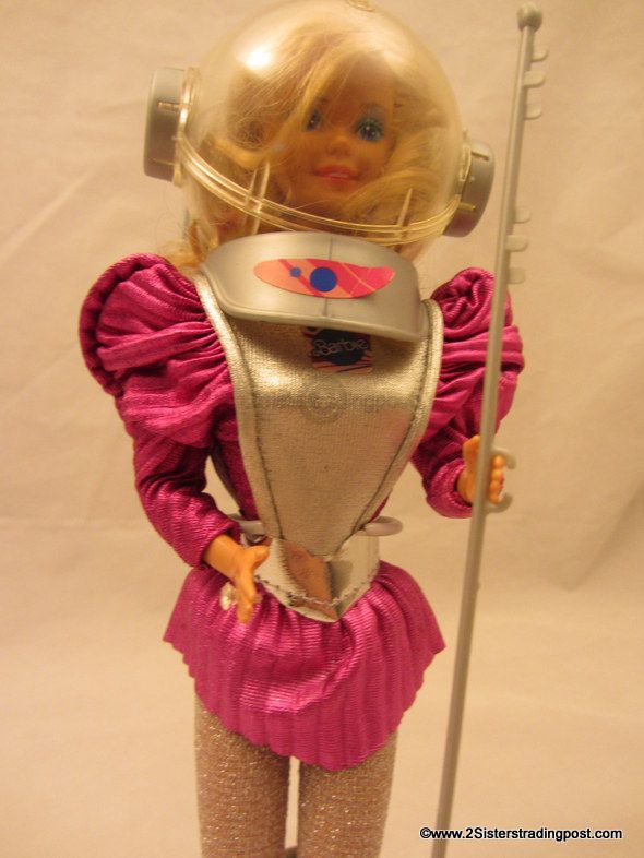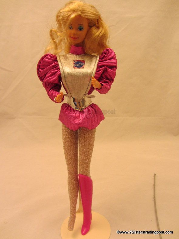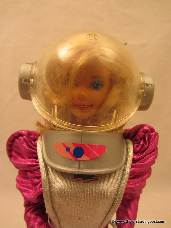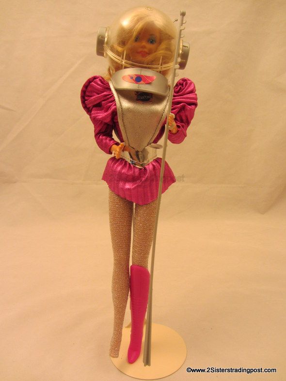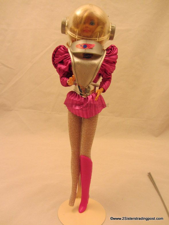 1985 Astronaut Barbie is in her original outfit. Includes body suit, tights, skirt with belt,