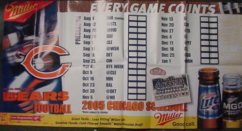 Here's a nifty trio of Bears' collectibles! A 3 × 6 foot MGD 2005 vinyl banner showing the 2005 schedule (11-5!!)A handsome embroidered patch "Salute to Soldier Field 1924 - 2001"Color photo of the Super Bowl XX champsAll are in excellent fresh condition. The banner is nice and clean (never been hung), with four grommets for easy hanging.
