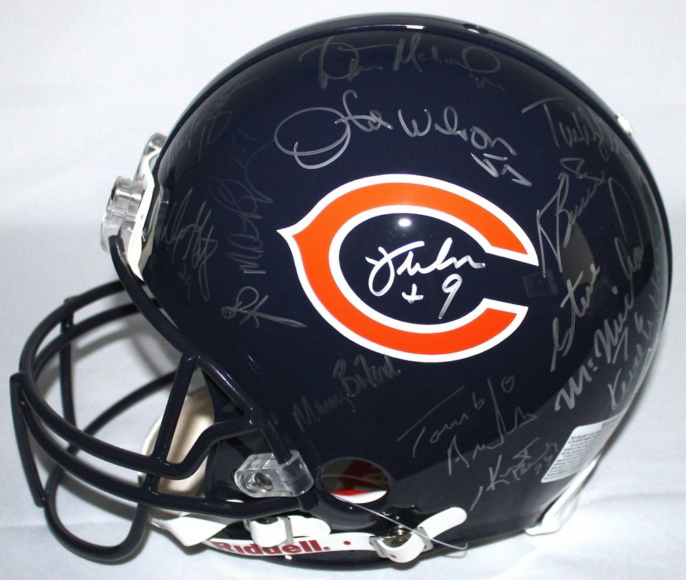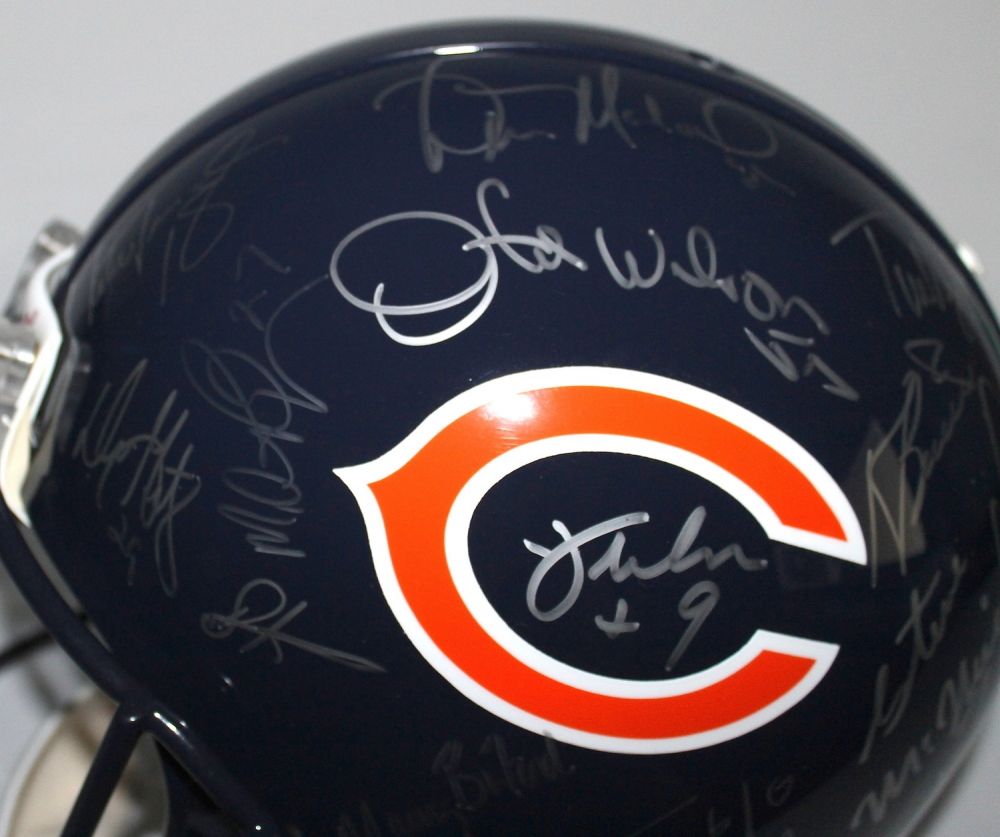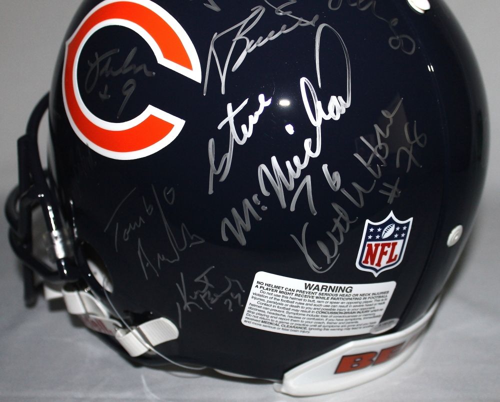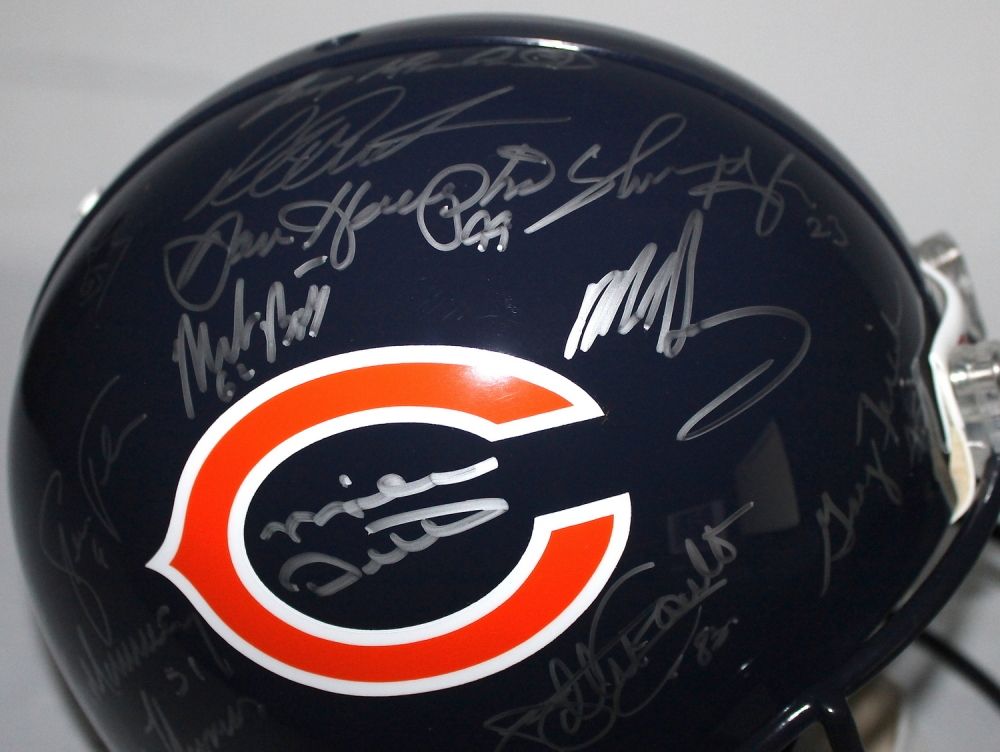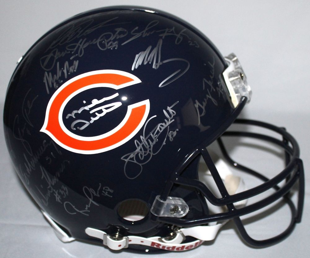 Riddell full-size proline helmet. Hand-signed in silver paint pen by (30) members of the 1985 Chicago Bears including Mike Ditka, Jim McMahon, Mike Singletary, Richard Dent, Dan Hampton, Steve McMichael, Gary Fencik, Jay Hilgenberg, Willie Gault, Wilber Marshall, Jim Covert, Mark Bortz, Keith Van Horne, Steve Fuller, Mike Tomczak, Kevin Butler, Otis Wilson, Mike Richards and others. The autograph includes an official Schwartz Sports Hologram and matching COA for authenticity purposes.