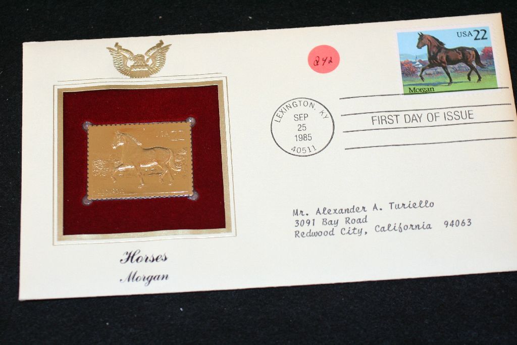 1985 First Day of Issue 22K Gold Replica Stamp W/Postal Stamp; Horses Morgan