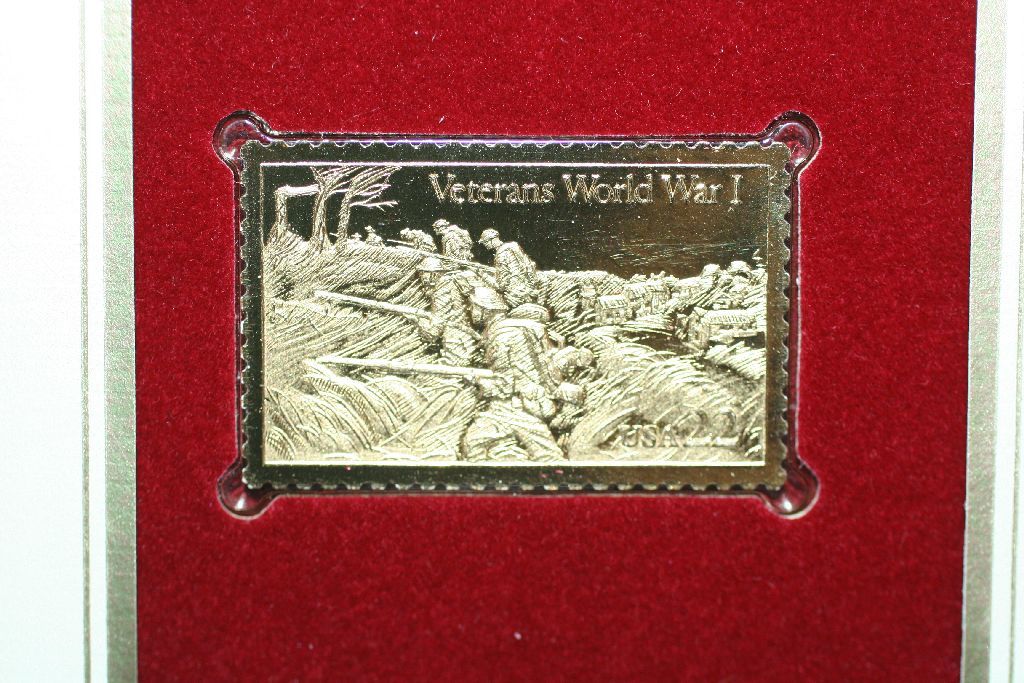 1985 First Day of Issue 22K Gold Replica Stamp W/Postal Stamp; World War I Veterans Fighting for Freedom
