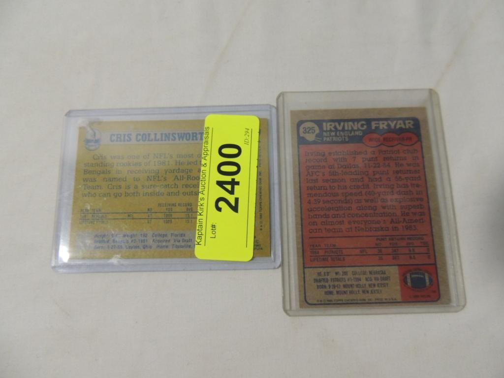 1985 TOPPS IRVING FRYAR #325 & 1982 TOPPS CRIS COLLINSWORTH #44 FOOTBALL PLAYER CARDS. TRADING CARDS. COLLECTIBLE. FOOTBALL MEMORABILIA. GOOD CONDITION AS SHOWN. SEE PHOTO FOR MORE DETAILS.