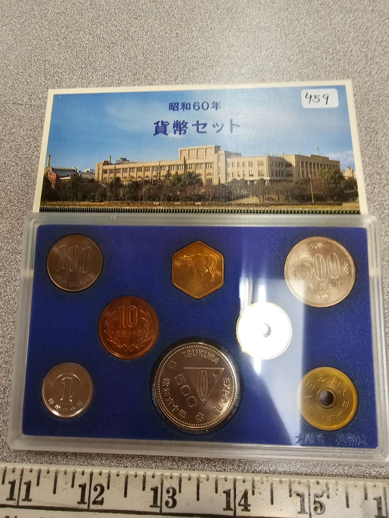 1985 Japan Mint Set. 7-coin set from 1 Yen to 500 Yen plus one 6-sided Mint Medal. Housed in original case & box of issue.