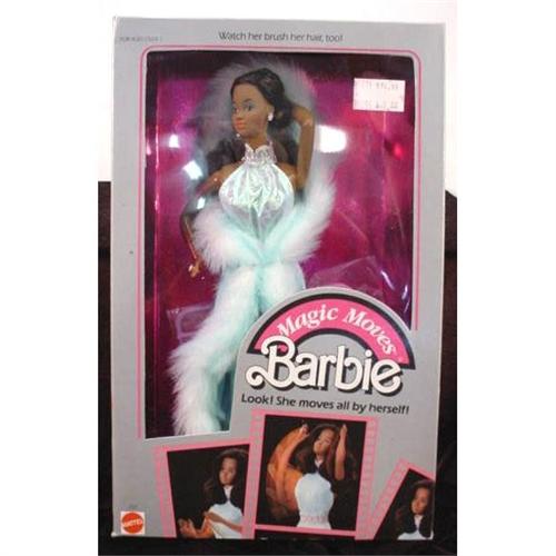 By Mattel, Magic Moves Barbie, made in 1985. Barbie moves all by herself. Doll is in mint condition as well as box. Box measures 13" x 8" x 2" and weighs 10 ounces. [81]