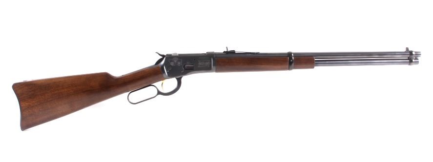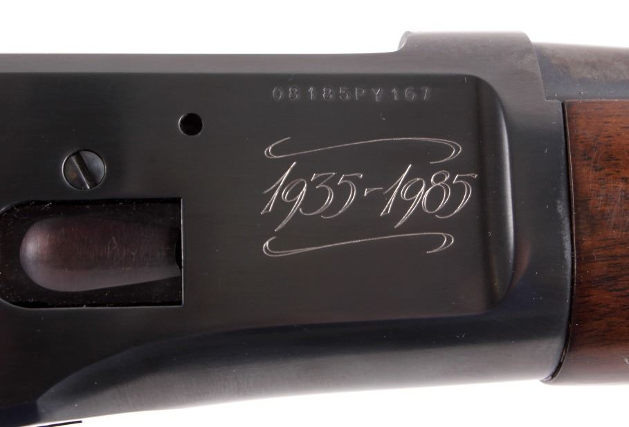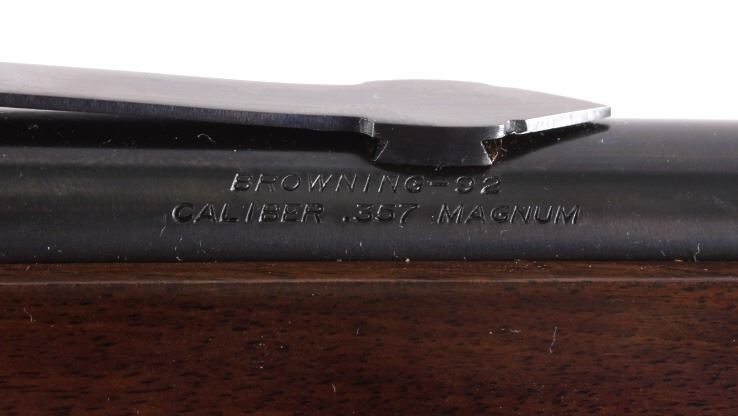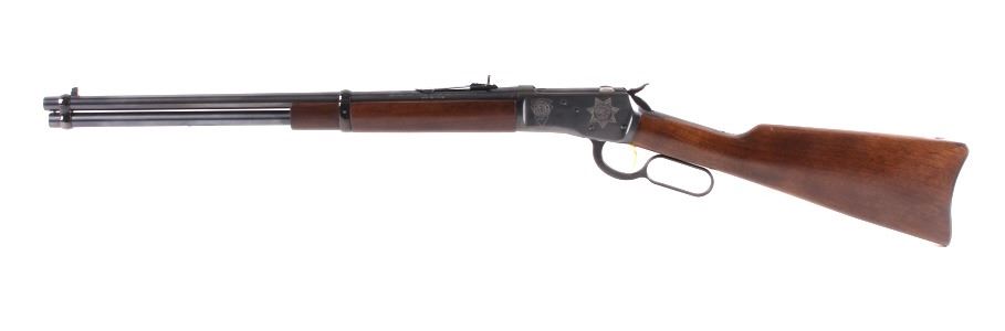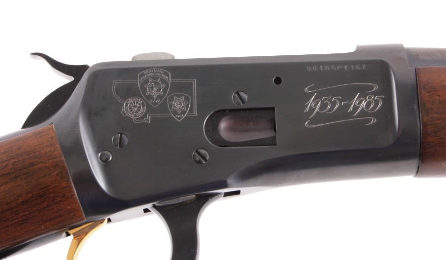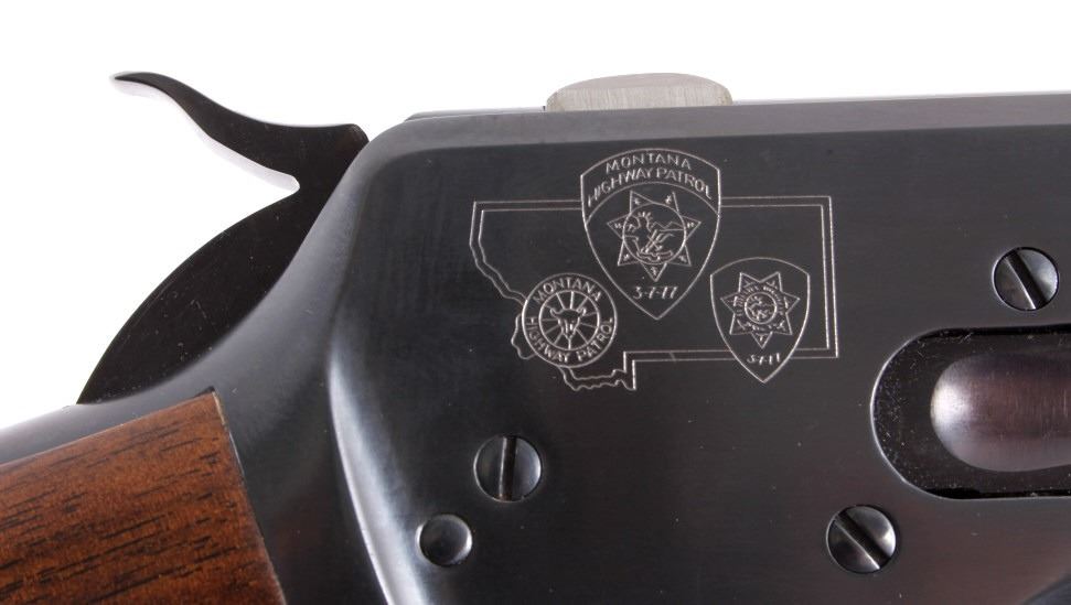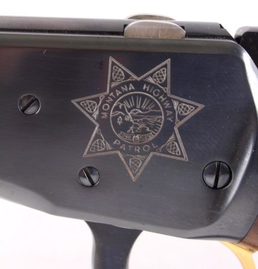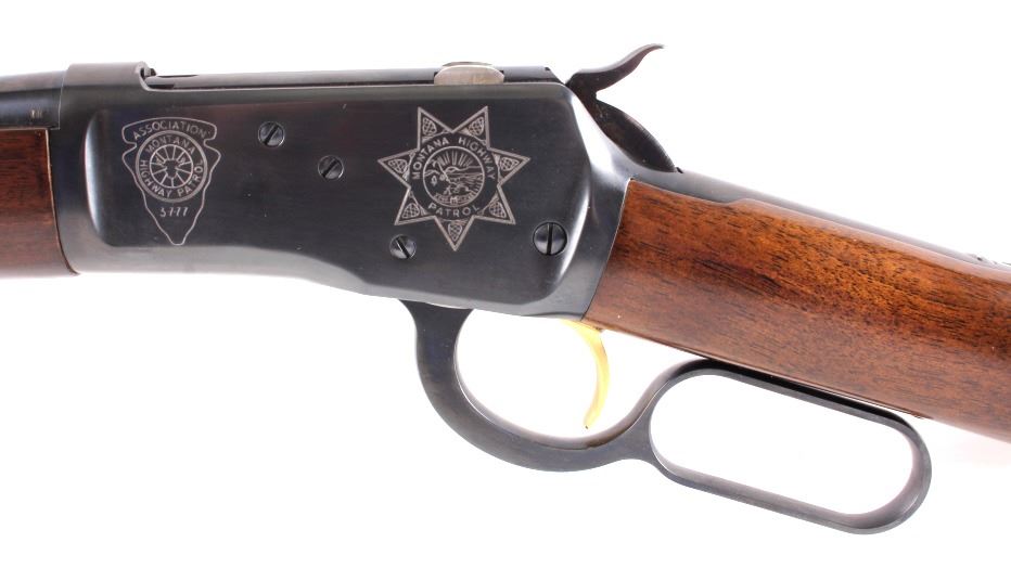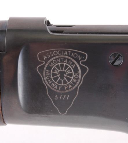 This is a Browning Model 92 Montana Highway Patrol commemorative lever action rifle manufactured in 1982. The rifle is chambered in the .357 Magnum caliber. The rifle commemorates the 50th anniversary of the Montana Highway Patrol which was established in 1935. The rifle has solid walnut hardwood stocks with a blued barrel and receiver. The receiver features special engraving on both sides including the arrowhead logo of the Montana Highway Patrol Association and a Montana Highway Patrol badge. The barrel is marked "Browning Arms Company Morgan, Utah & Montral Q.P." and "Browning-92 Caliber: .357 Magnum". The Montana Highway Patrol commemorative rifle is in very good condition. Serial number 08185PY167 manufactured in 1982. This is a modern firearm and requires FFL or NICS background to transfer. The rifle measures 37.5" with a 20" barrel.