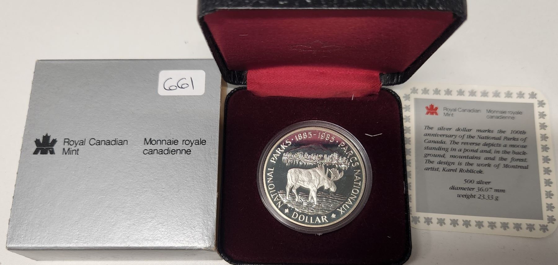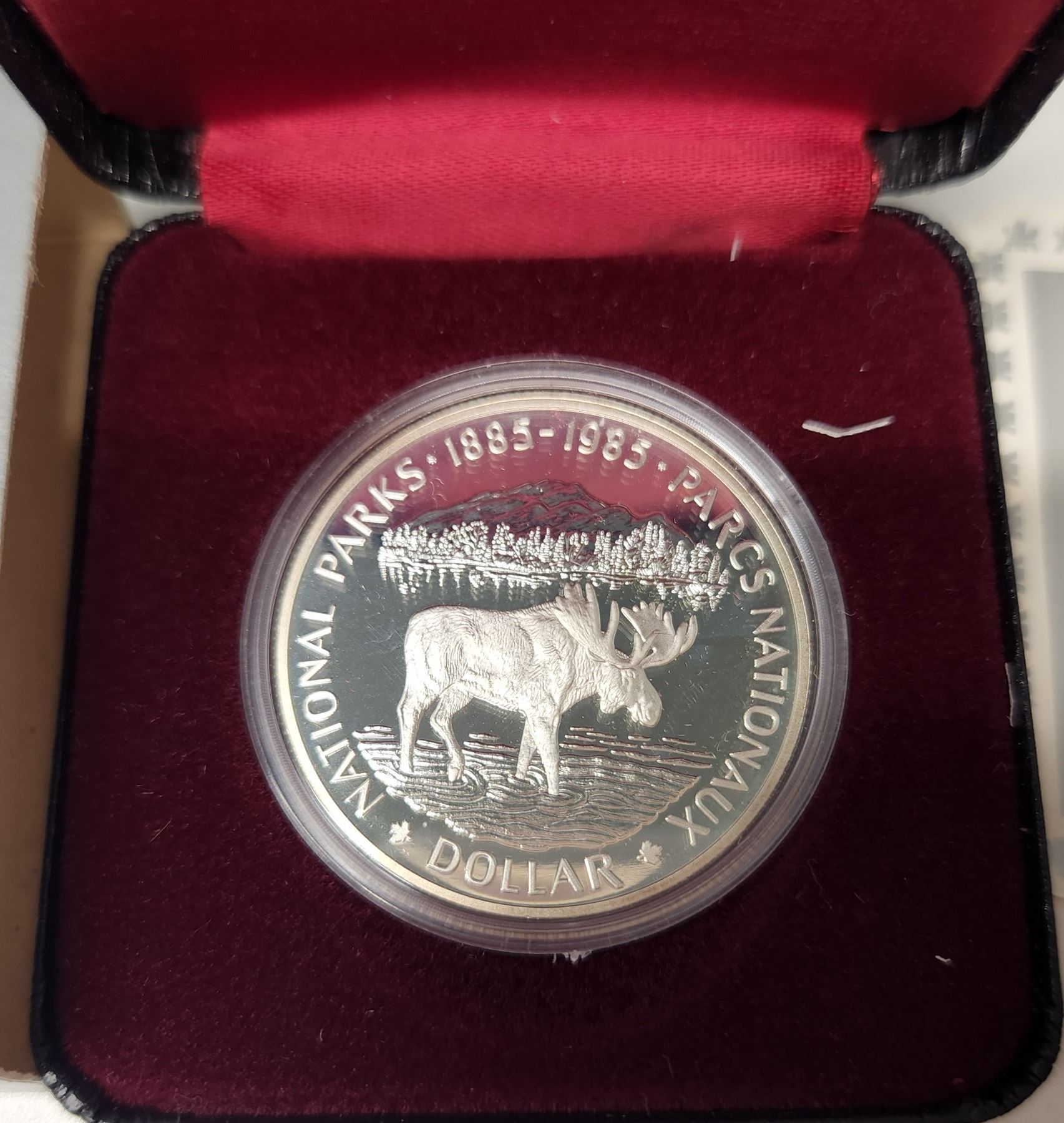 1985 National Parks Proof Silver Dollar. Commemorates the 100th Anniversary of the founding of the National Parks of Canada. Bright White with Ultra Heavy Cameo. In black case of issue.